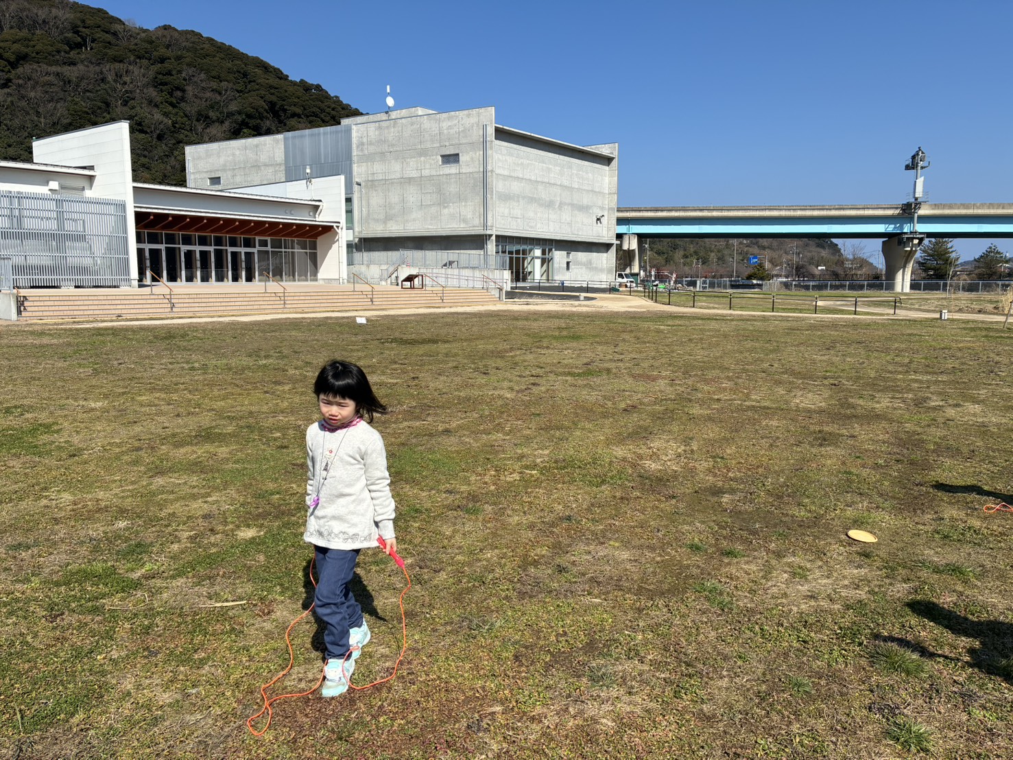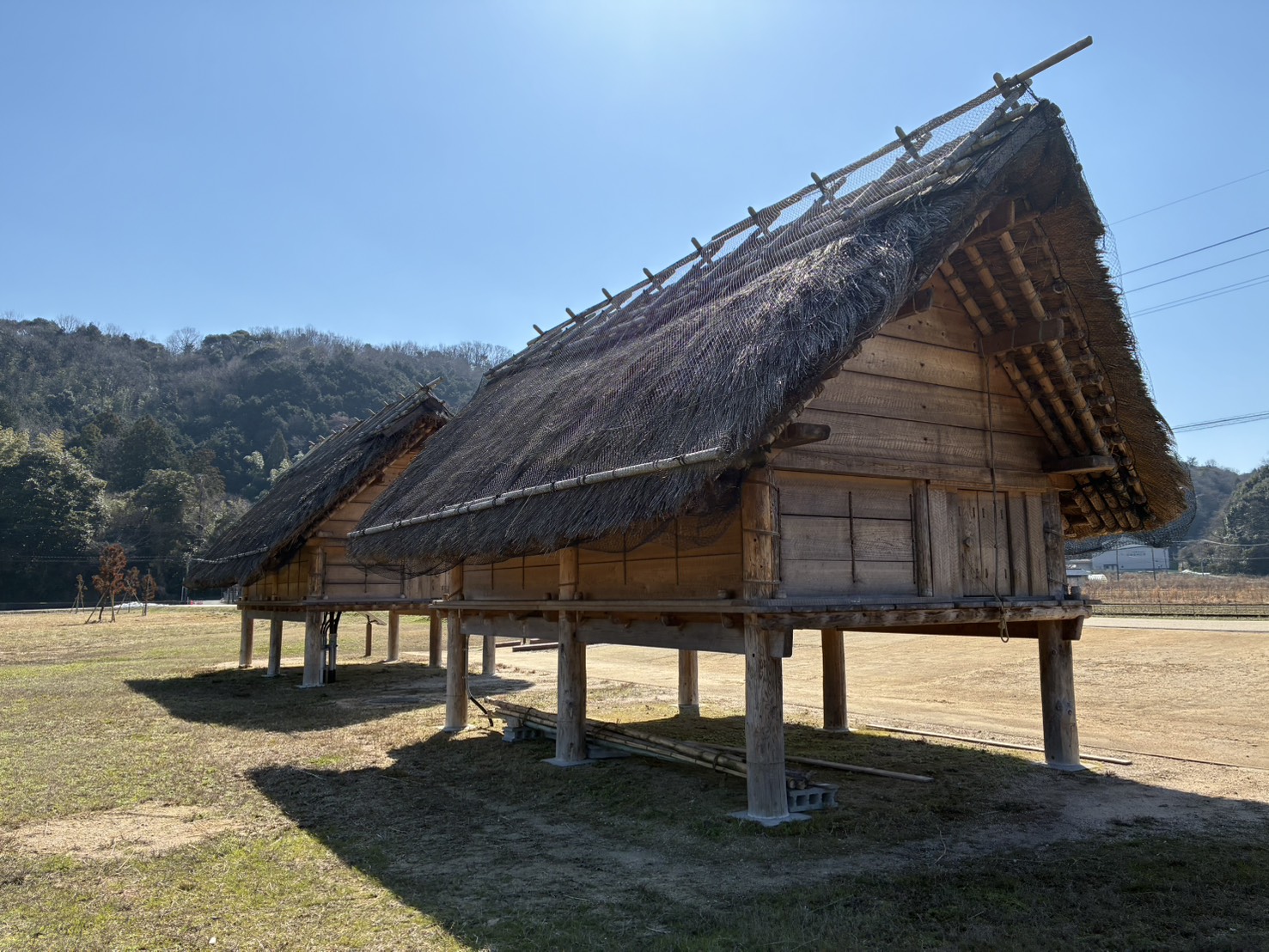 外には高床式倉庫(再現)や広い芝生エリア。さらに入口ではフリスビー、縄跳び、凧などの無料貸し出しがあり、天気の良い日は本当に最高の環境です。