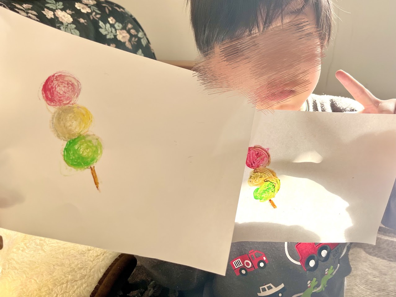 使う色のクレパスはもちろん、描き方が工程ごとにとても分かりやすいので、初見でもこんなに美味しそうなお団子が完成しました!