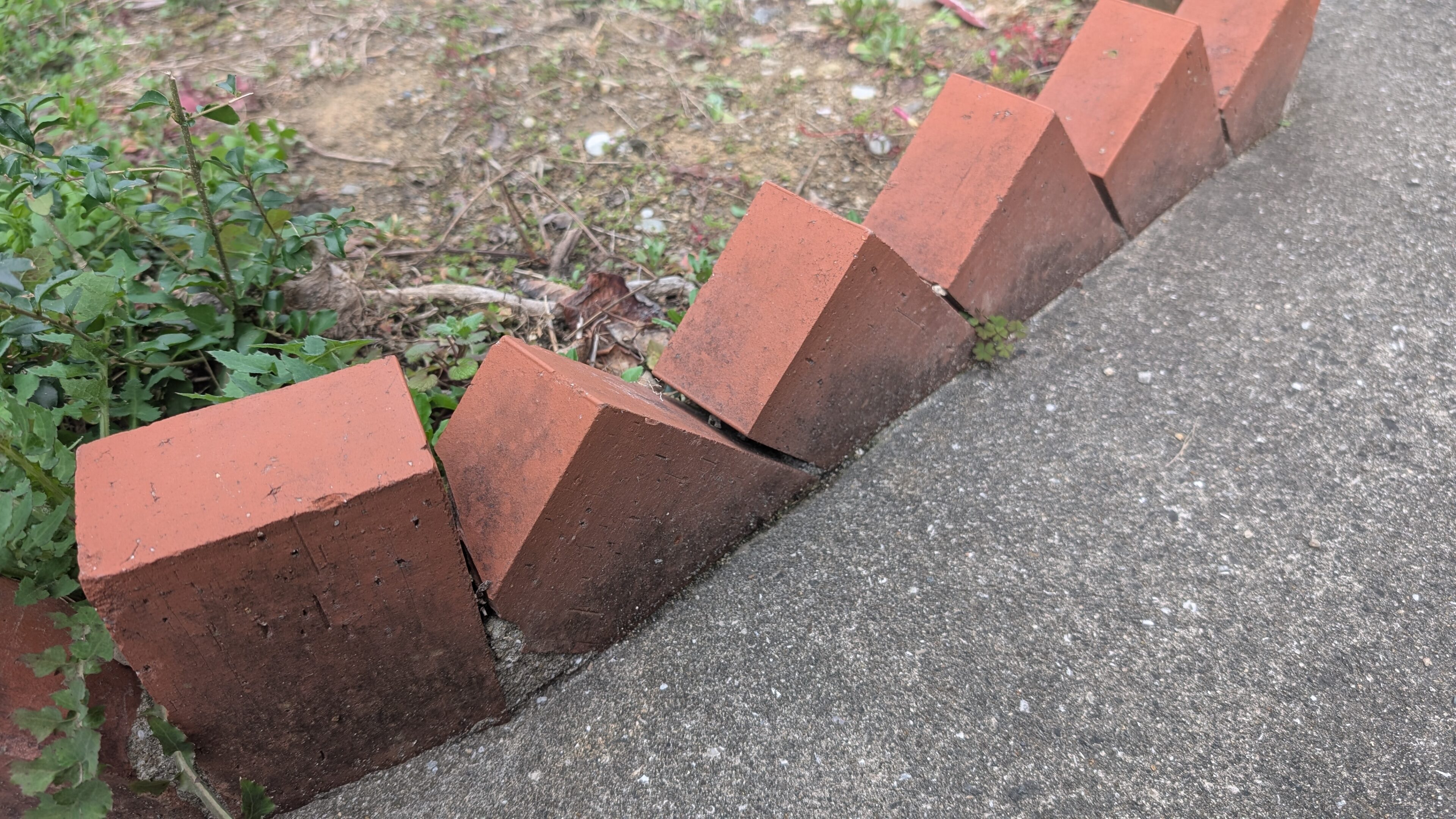 前の住人の方が手作りされた花壇で、レンガが斜めに埋め込まれており、角が上を向いたデザインになっていたのです。