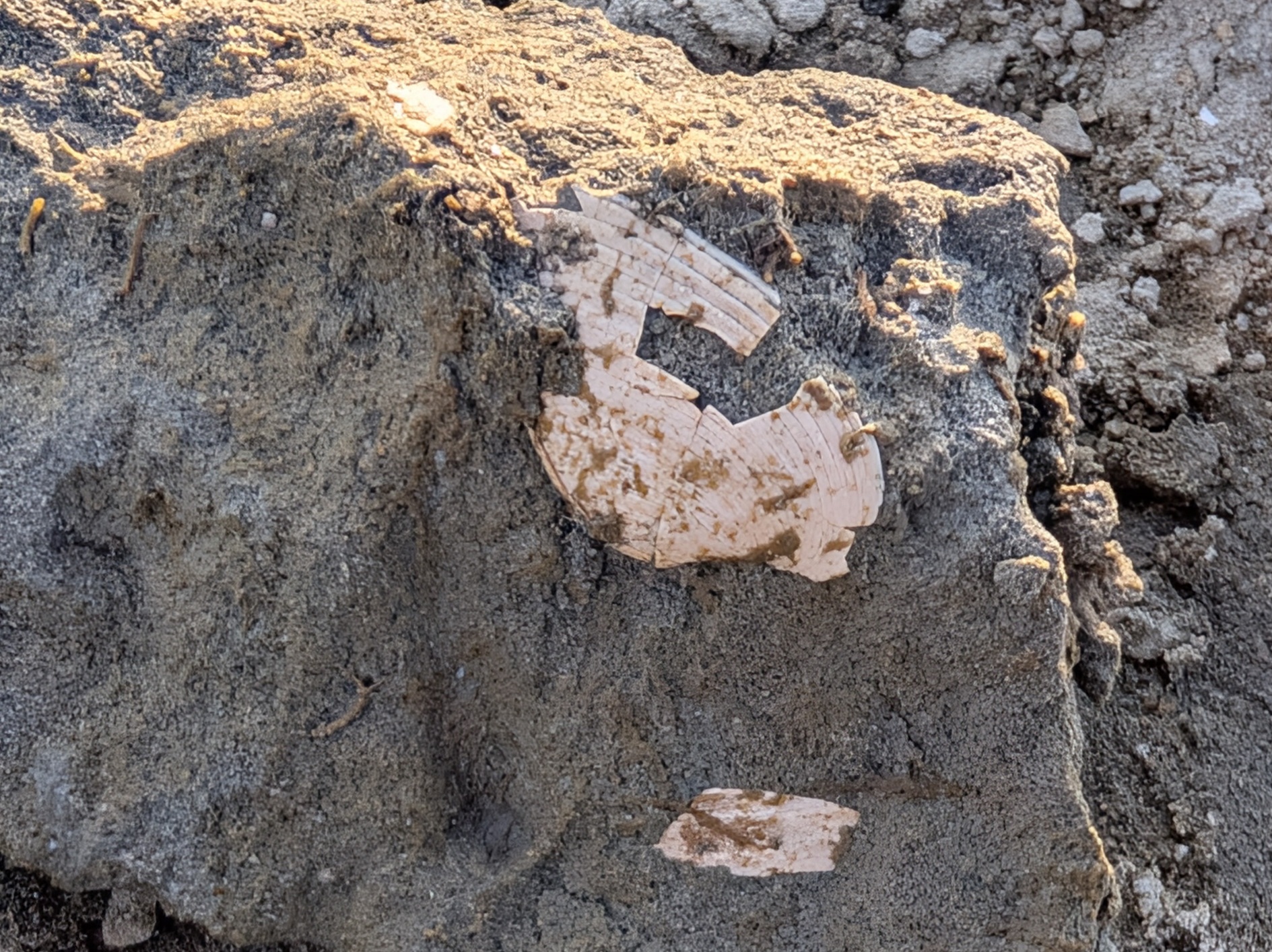我が家も泥岩層を確認しながら歩き、貝殻の破片をいくつか見つけたので持参した100均のヘラで周囲から少しずつ掘り出していきます。