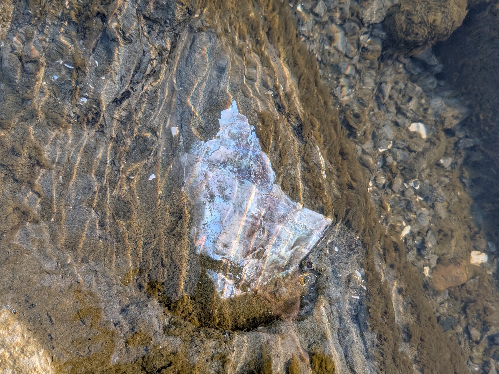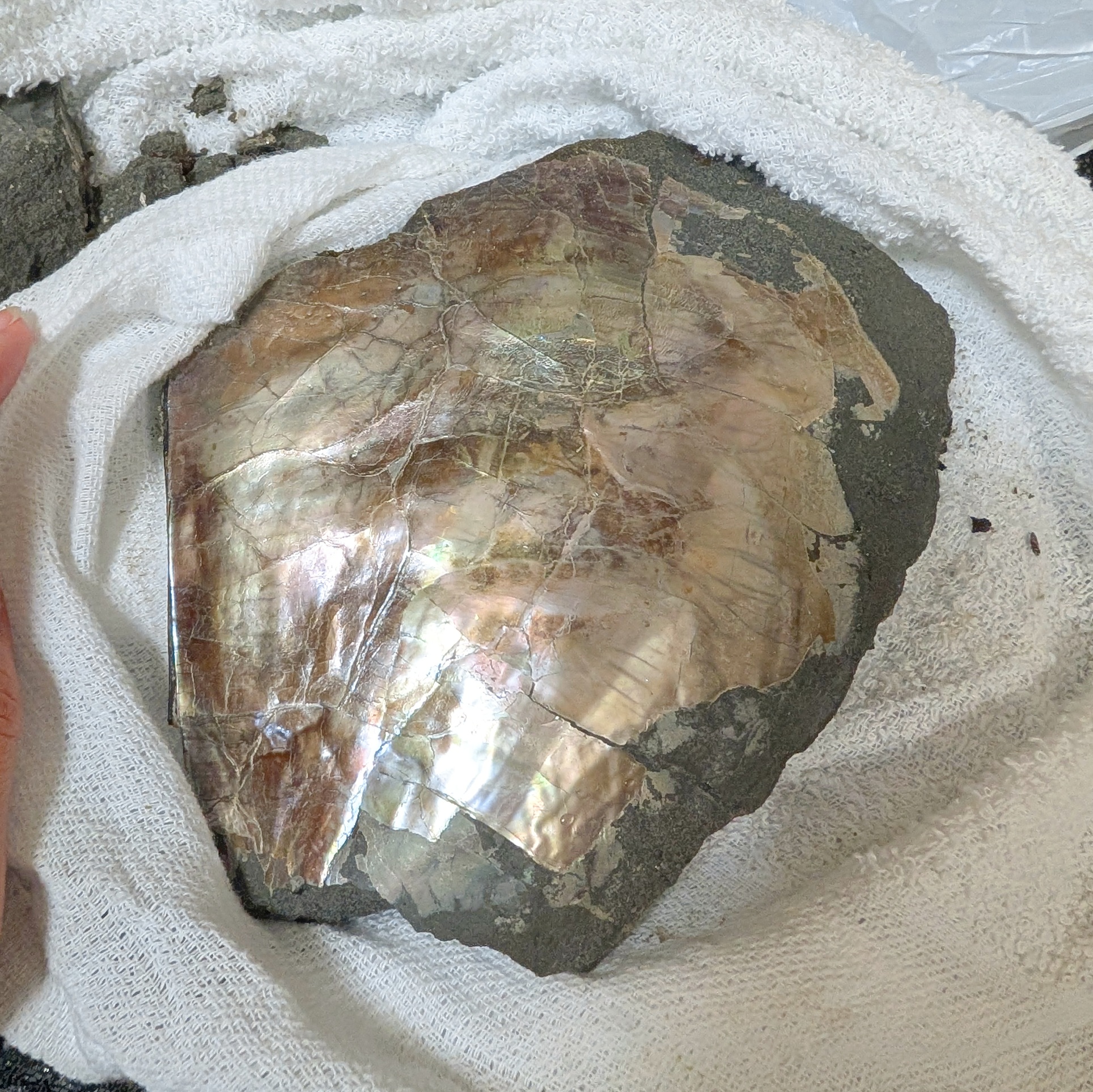 発掘を続けていると、泥岩層の水中に強く虹色に輝くものを発見しました。その輝きから螺鈿のようだと水中でも分かるほどでしたが、掘り出しても正体は分かりません。