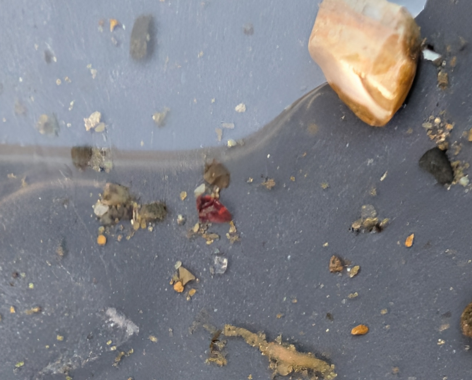 …結果は砂金は見つかりませんでしたが、代わりにガーネットの原石をいくつか拾うことができました。赤い石なので比較的見つけやすいです。