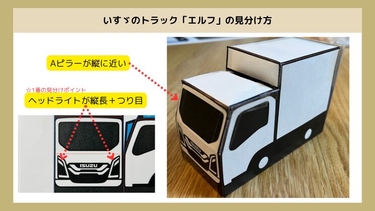 「エルフ」は清掃車・ミキサー車など様々な働く車に変身しているので、最初はフロント部分の「ISUZU」の文字を頼りに探していました。
