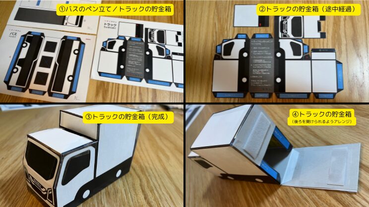 「いすゞタウン」のサイト内にて、トラックの貯金箱とバスのペン立てが作れるペーパークラフトがあります。