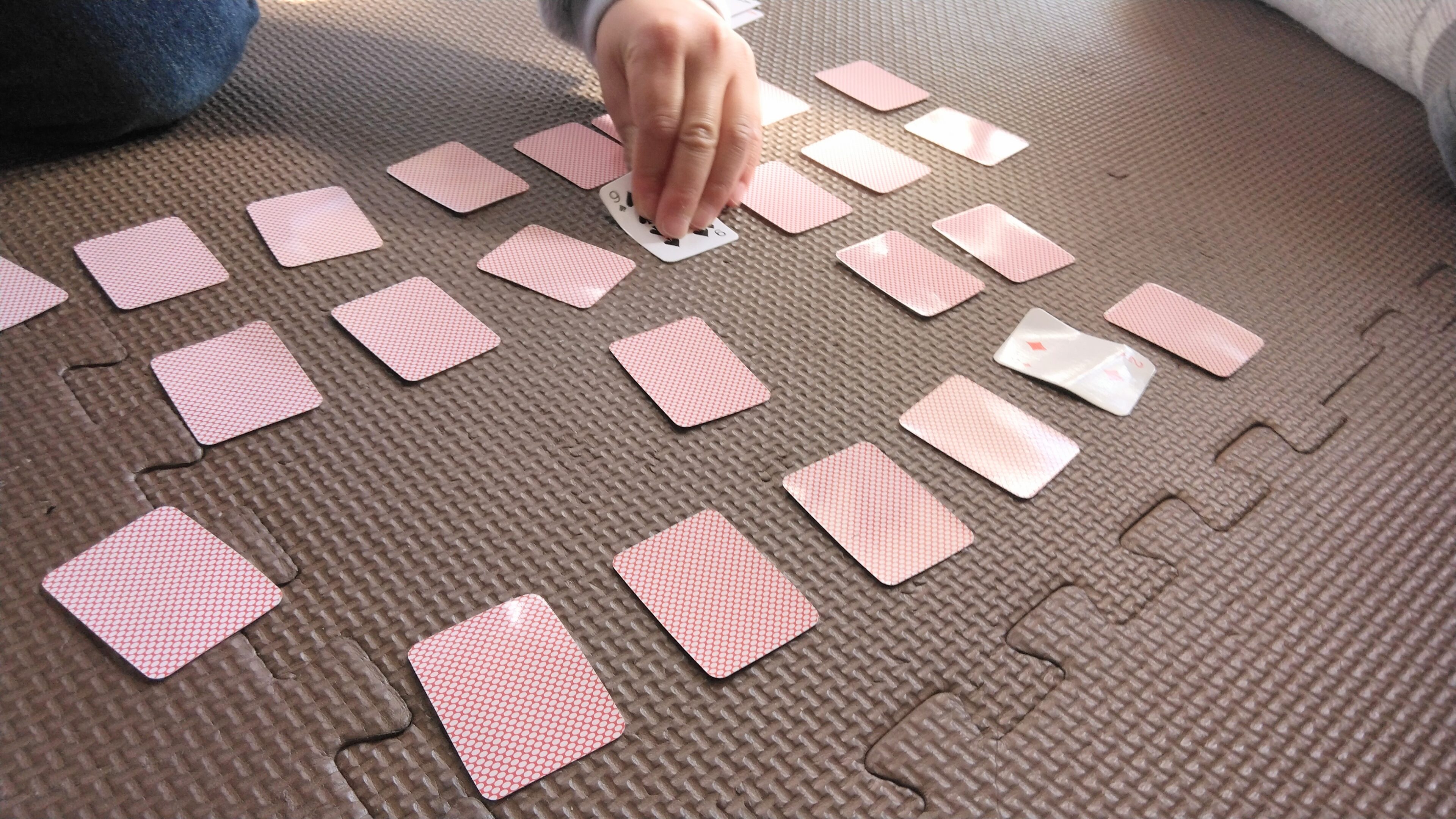 この「ミニミニトランプ」、大人の手では持ちづらく、シャッフルしづらいところが難点。ババ抜きとか大富豪とか、手に持って遊ぶゲームには不向きです。一方で向いているのは並べる系。わが家は神経衰弱で大盛りあがり。全部並べても「ミニミニ」だからコンパクト、狭い場所でも遊べて便利です。ただ白熱しすぎると折り目がついてしまうので要注意です。