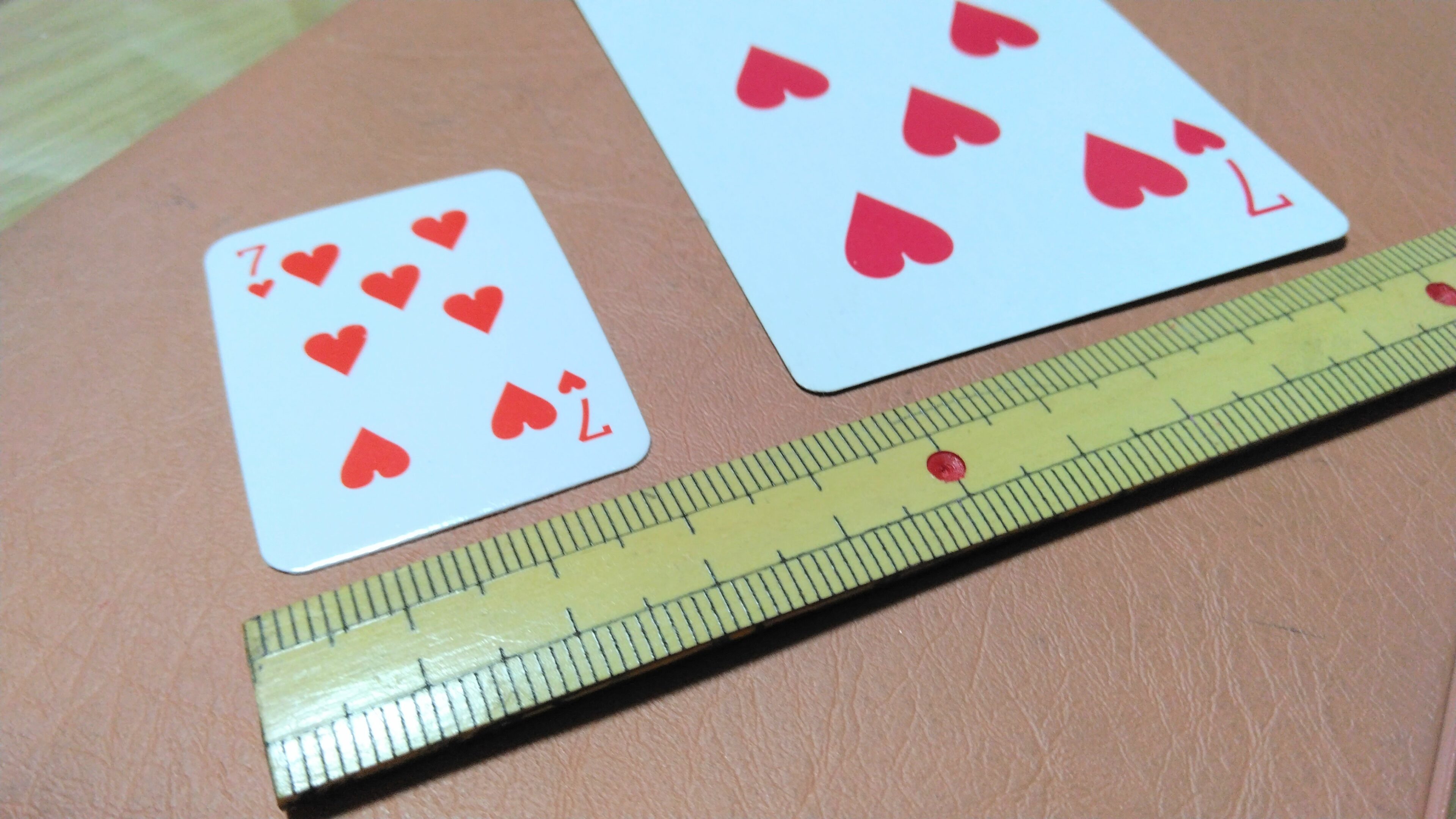 トランプのサイズは、主にブリッジサイズ(約58mm×89mm)とポーカーサイズ(約63mm×88mm)があり、日本ではブリッジサイズが主流だそうです。手になじみやすく、片手で扱いやすいという特徴があります。今回娘が当てたのは約30mm×40mm。ブリッジサイズの一般的なトランプと並べると親子のようなサイズ感です。「子ども用」と称するには十分なサイズ感、娘の宝物になりました。
