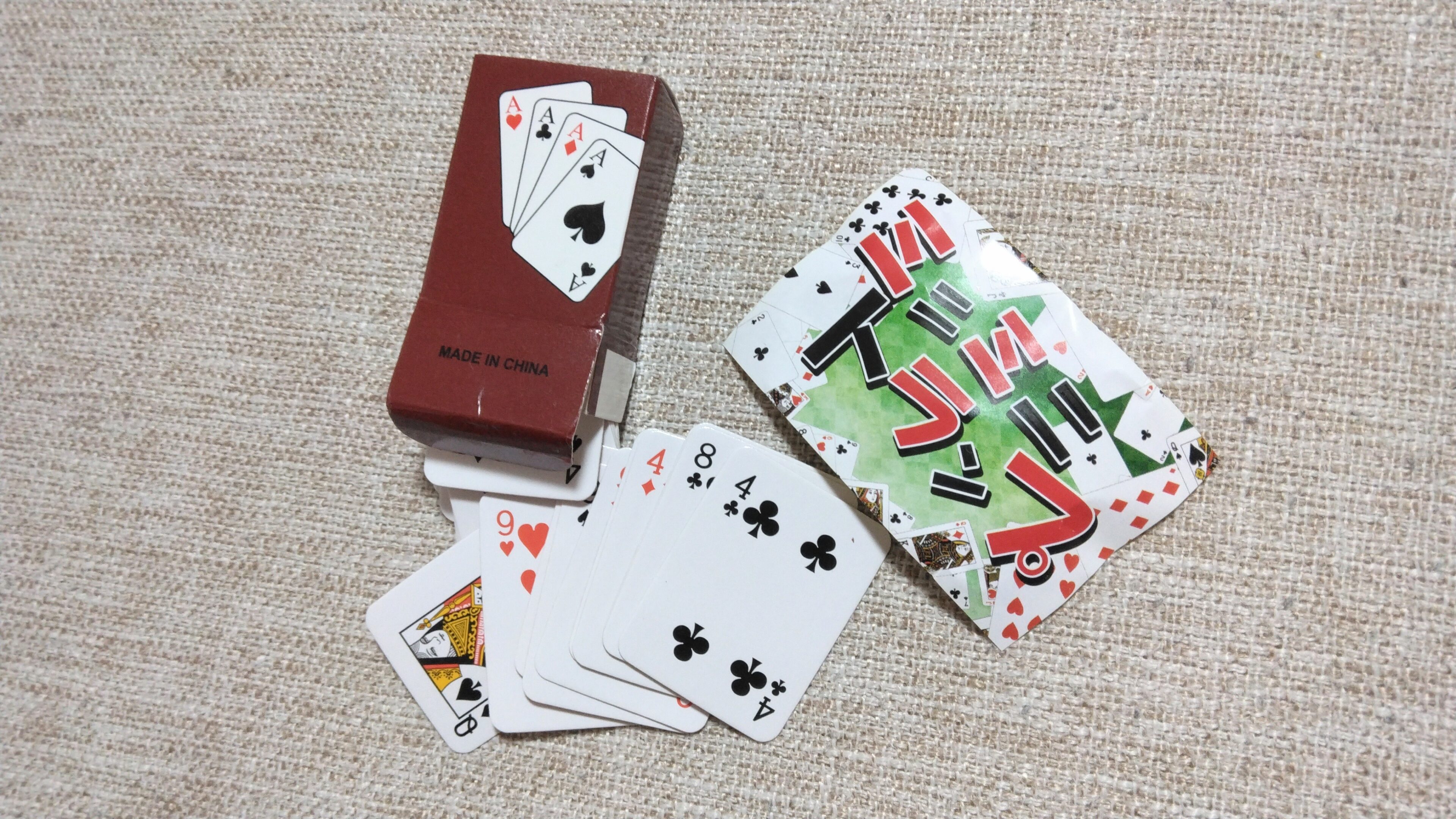 カプセルから出てきたのは「ミニミニトランプ」。ジョーカー2枚含む54枚がびっしり入っていました。びっしりすぎて、娘の手で出し入れするのが困難なほど。