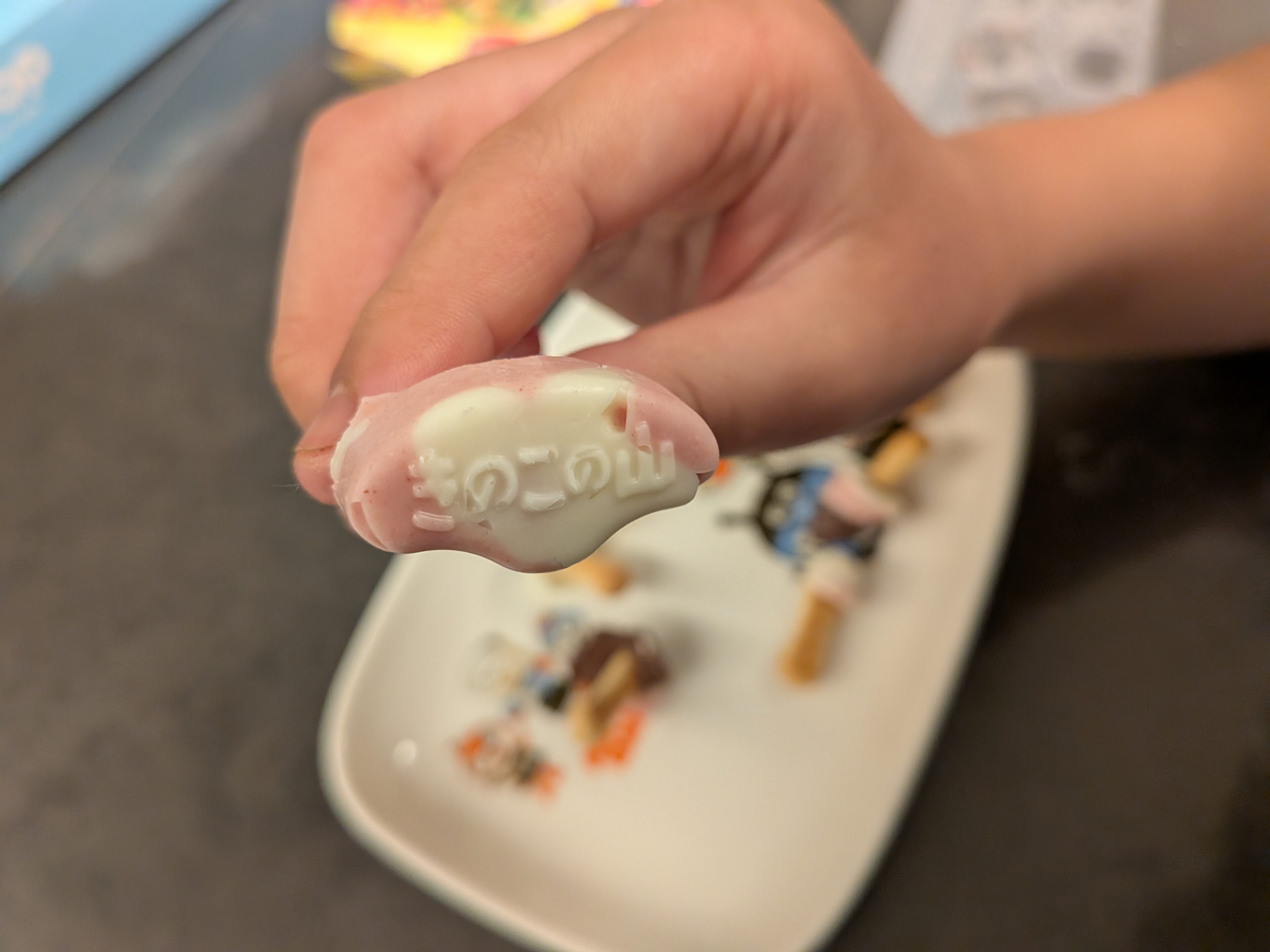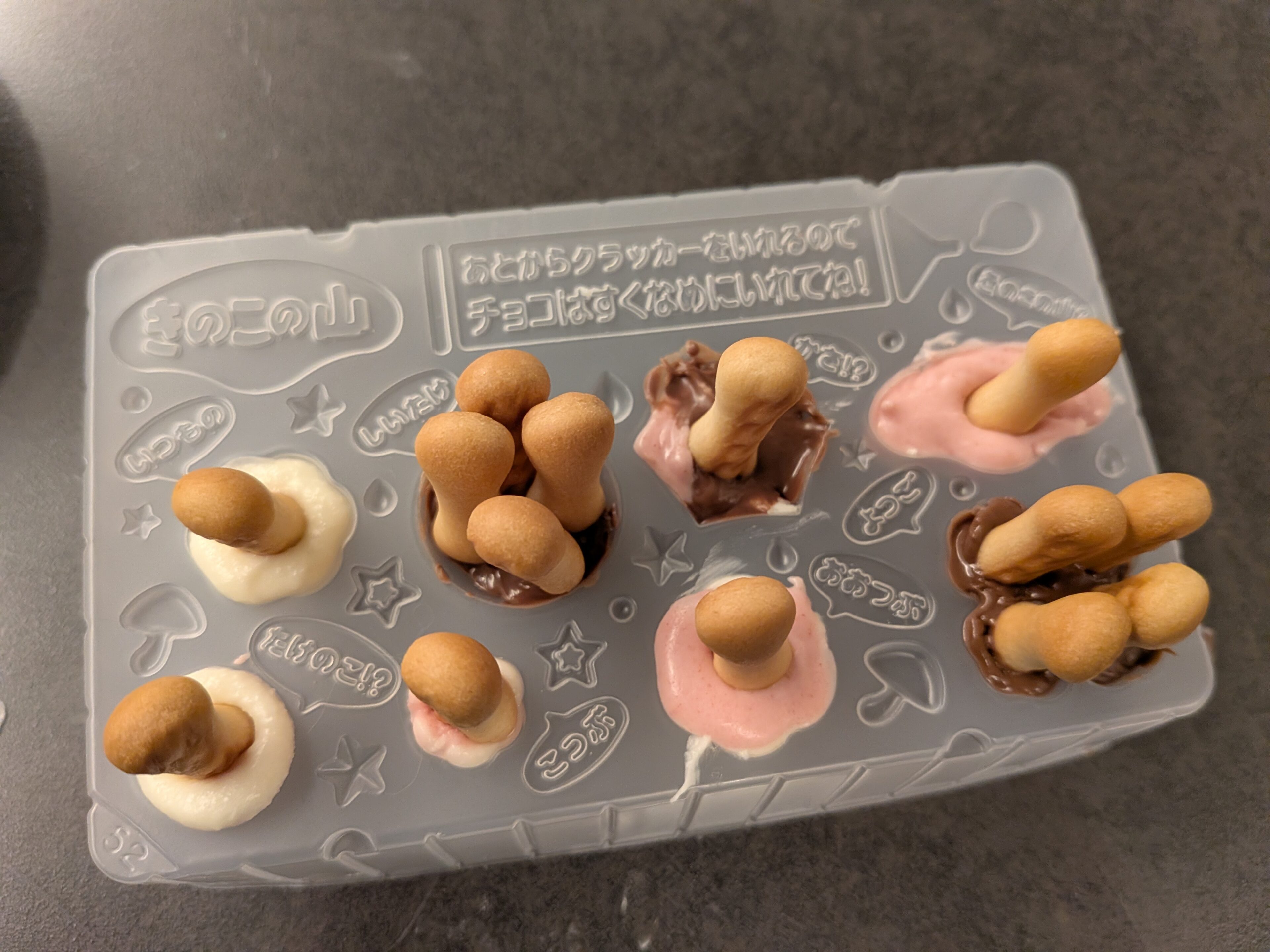 工程はとても単純で付属のチョコレートスティック(茶色・白・ピンク)をキノコの山の型にいれて冷蔵庫で30分冷やして固まれば出来上がり!