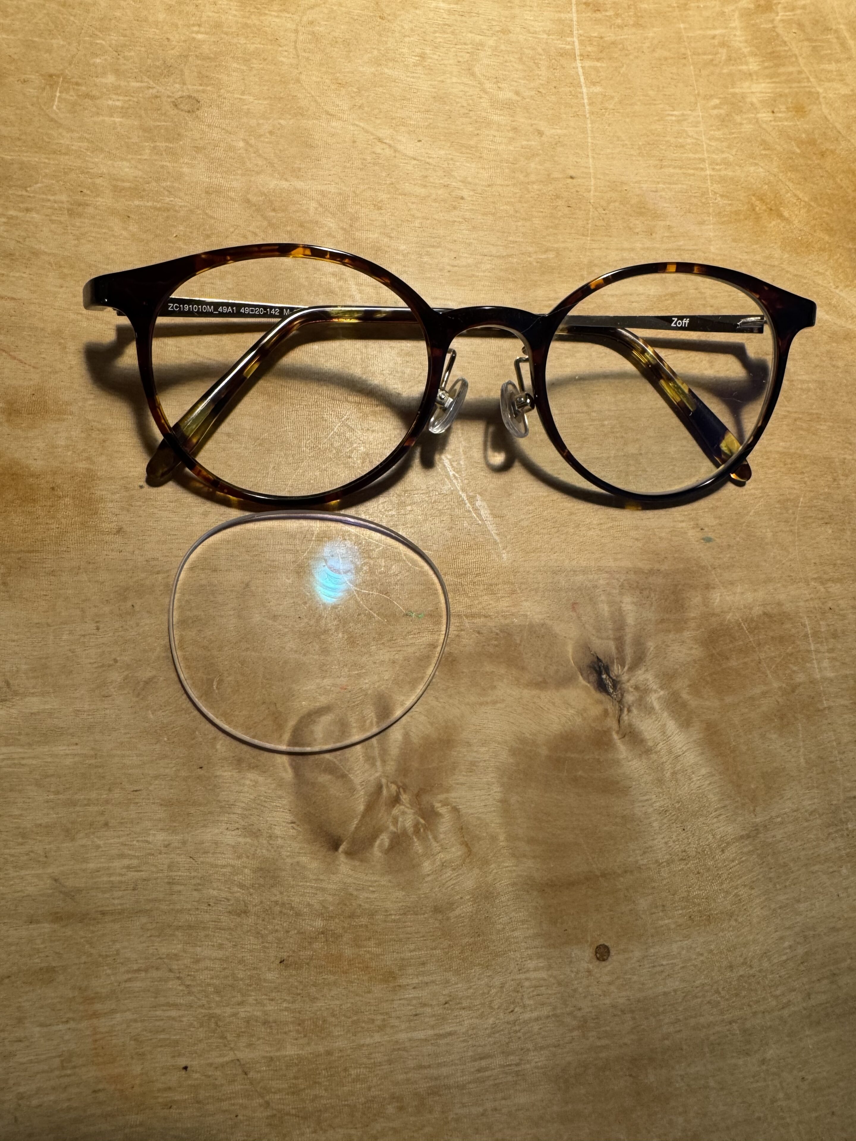 恥ずかしながら、いつも鍵やメガネを無意識に色んな場所に置いてしまう癖がありまして、今回、レンズ探しに苦労しました。メガネケースの中はない、鞄の中もない、メガネを置いていた枕のところにもない。