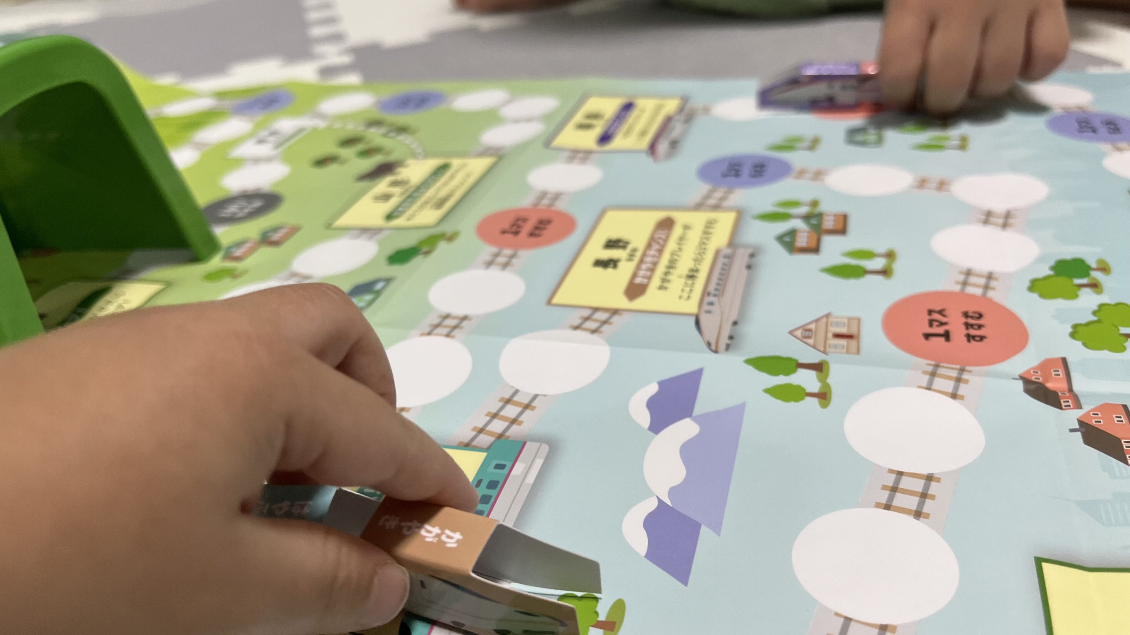 「すごろく」はついに「線路下の背景」と化してしまい、双子は線路の上を新幹線のコマや他の電車も走らせて遊んで満足していました。