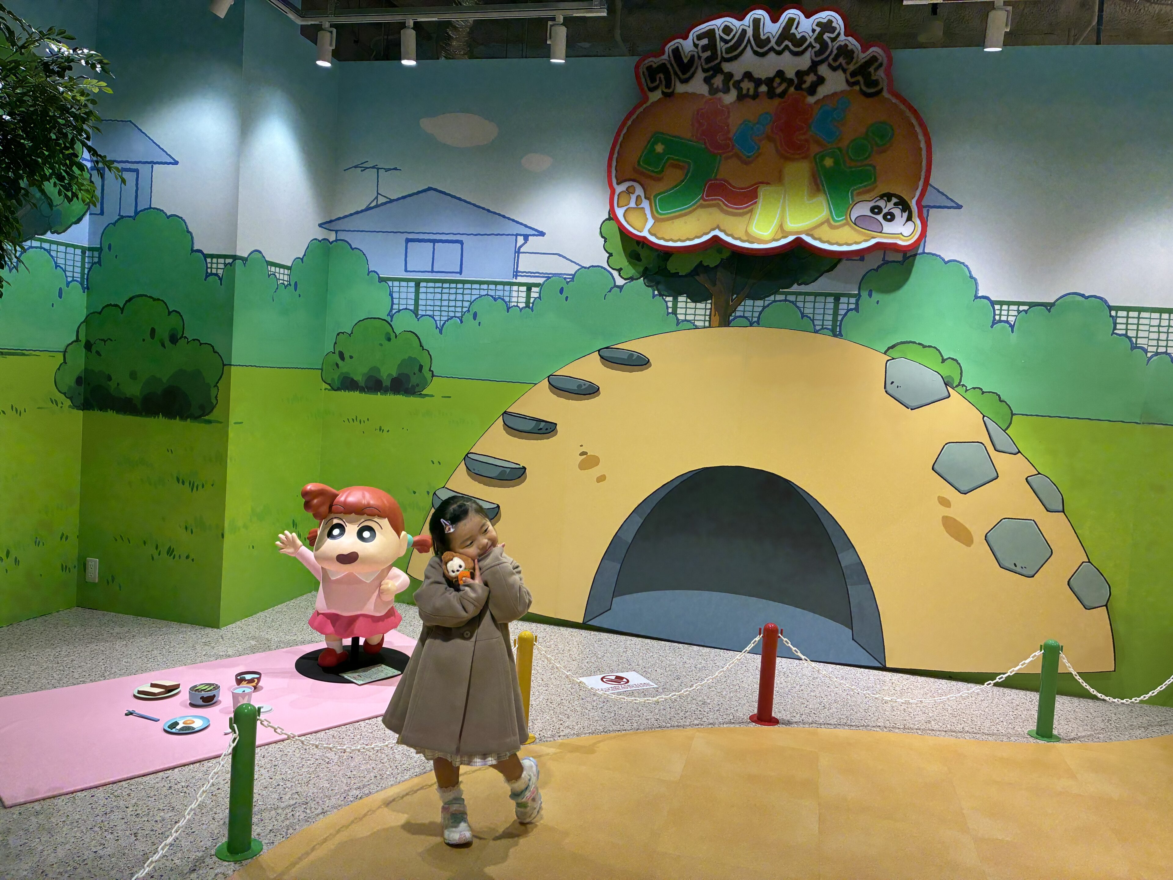 店内入口はしんちゃん達が遊んでいる「馬の尻公園」の門を通ります。再現クオリティが高すぎていつもテレビでアニメを見ている人からすると大興奮です!