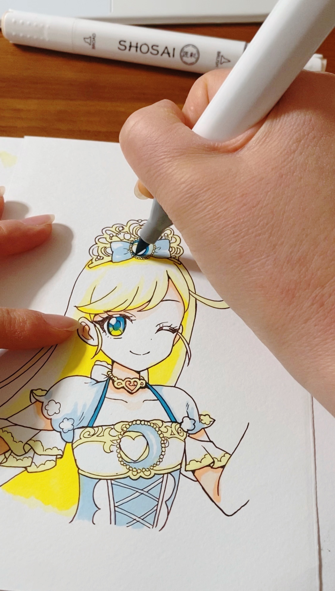 Amazonで購入した油性カラーペンを使いました。昔はコピックを使っていたけどもう少しお安いやつです。性能はコピックに似ています。お手本を見ながらカラーを乗せていきます。
