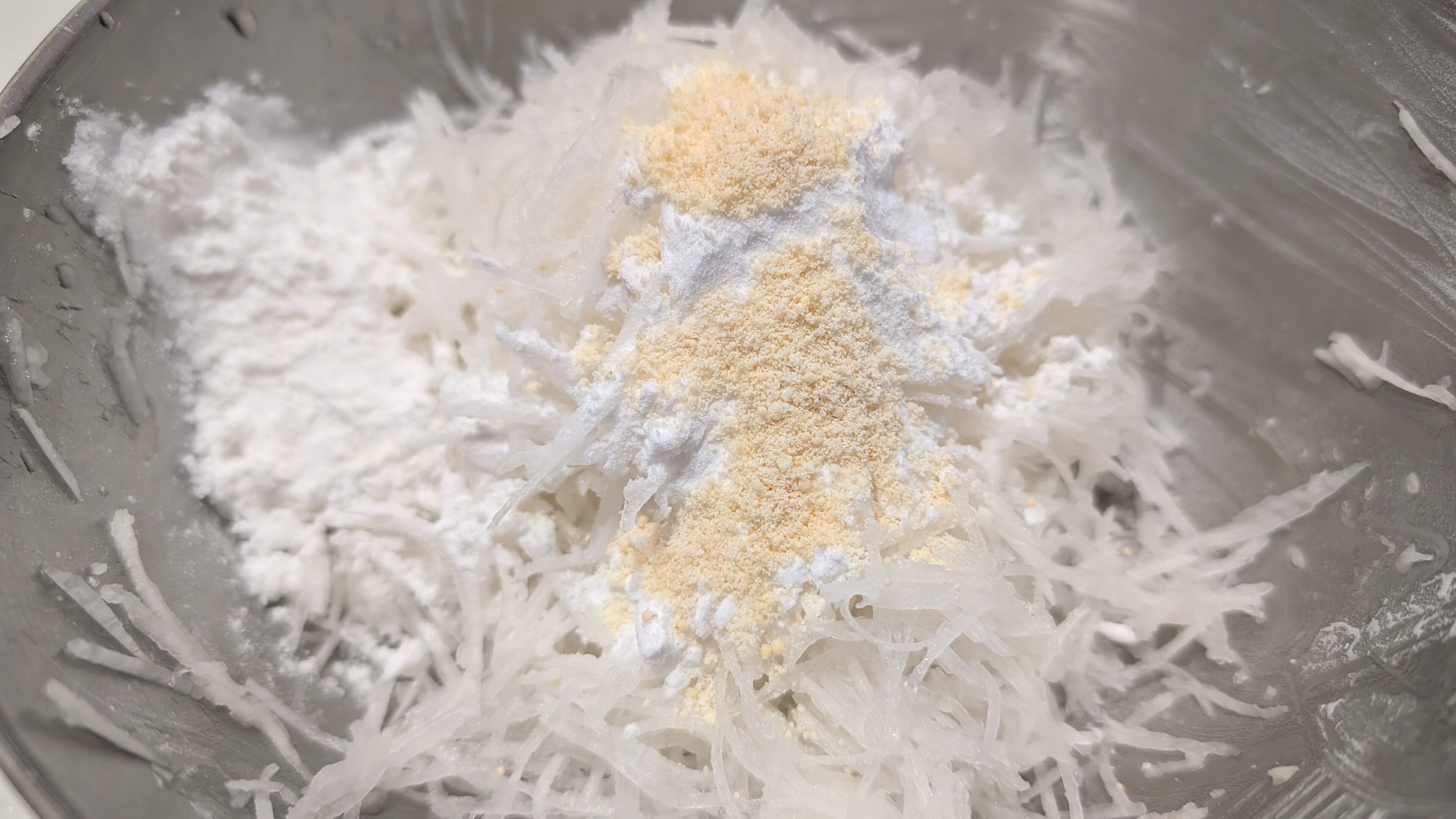 2.千切りにした大根に、片栗粉と鶏がらの素を入れて、箸でよく混ぜる