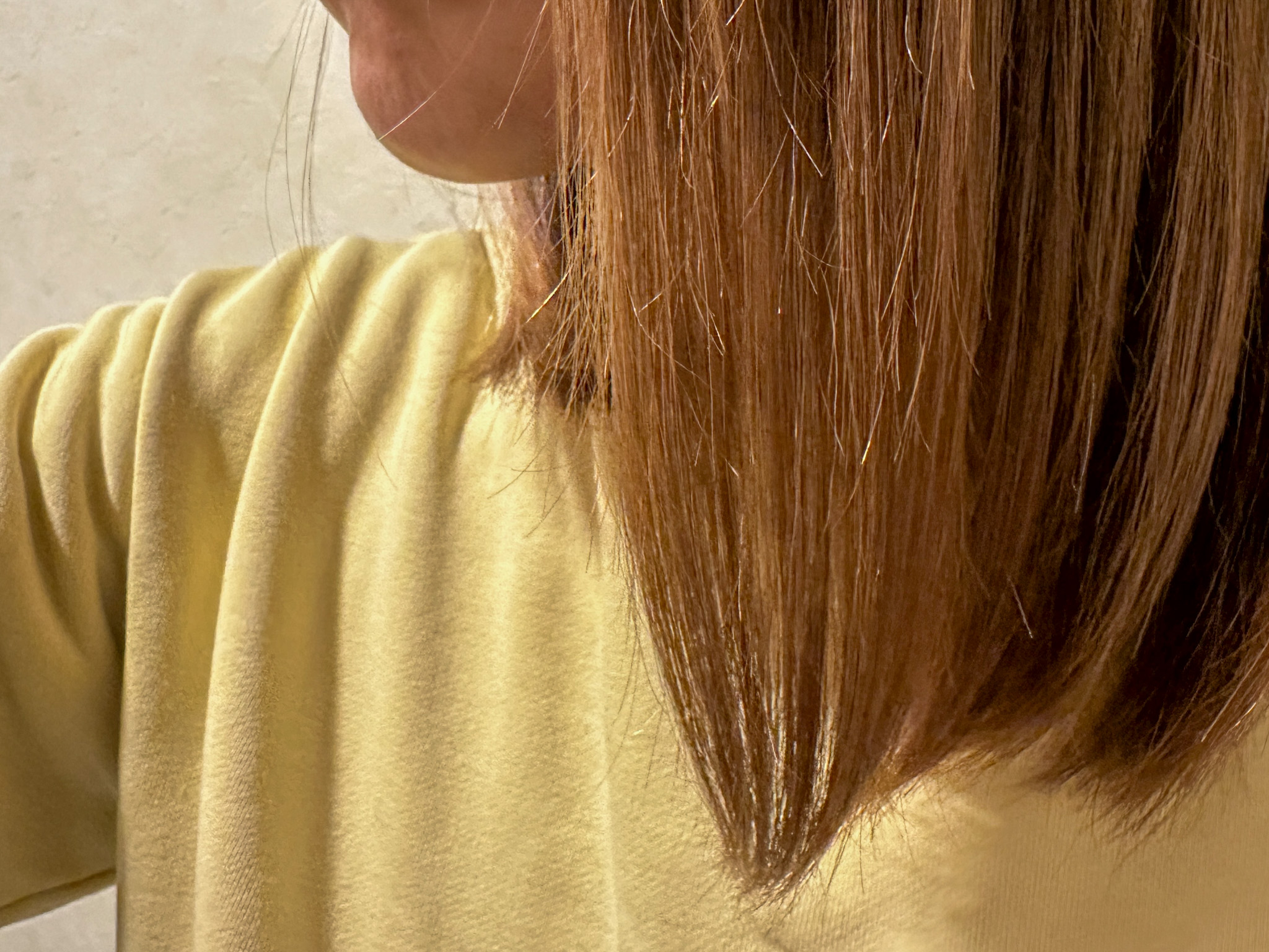 現在私は毛先が鎖骨につくくらいのセミロングで、40歳までに「地毛のサラサラロング」を目指しています。ただ今は中途半端な長さなので、毛先のパサつきが気になる状態。そんな中でまず感じた変化は、体感ですが、いつもよりドライヤー時間が短く済んだように感じました。子どもたちの髪を乾かすのを優先して、自分の髪は後回しになりがちなママにとって、この数分の時短がかなりありがたい。お風呂上がりのバタバタ時間が、ほんの少し楽になりました。