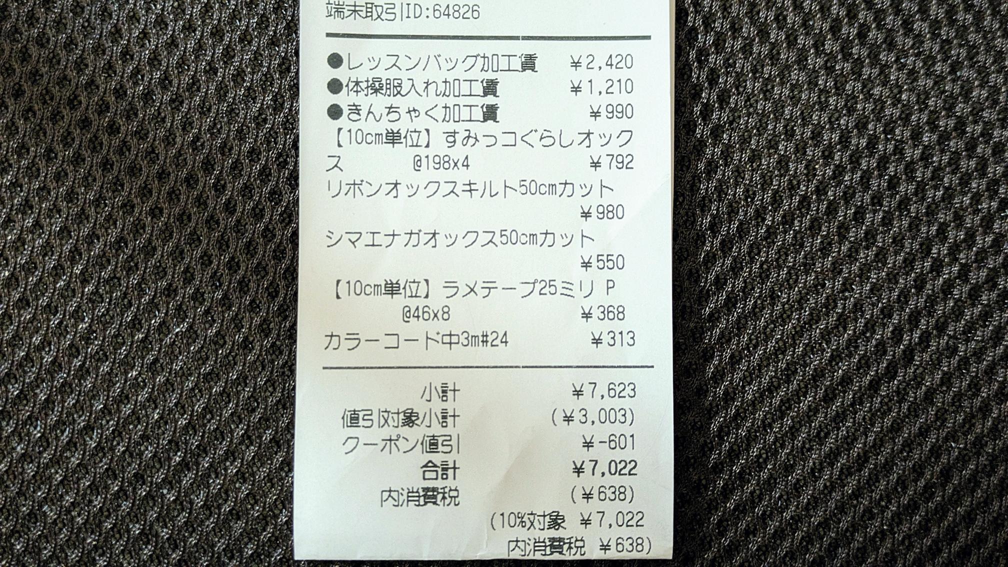 そして生地代を含め、トータル7623円でした。今回は入学入園フェアをやっていたので、生地代の割引がありました。