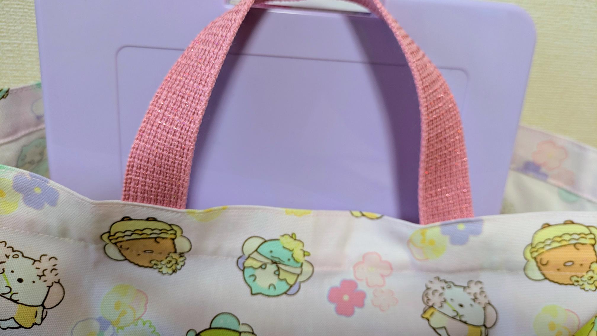 手提げ袋にすみっコぐらし、体操服袋にパープルのリボン柄の生地、巾着袋にシマエナガの生地を選びました。