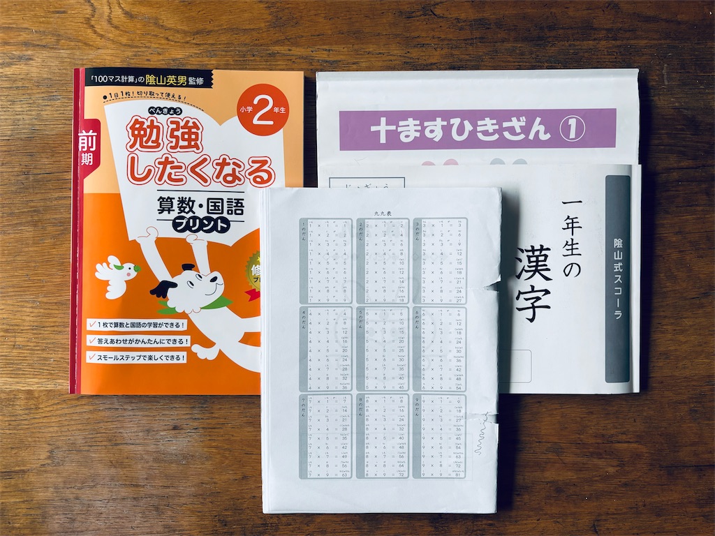 2年生の先取りドリルとして現在取り入れているのが、教育学者の 陰山英男 先生監修の『勉強したくなる 算数・国語プリント』です。この教材は「表:算数・裏:国語」という構成で、1枚で国語と算数の両方を学習できるのが特徴。