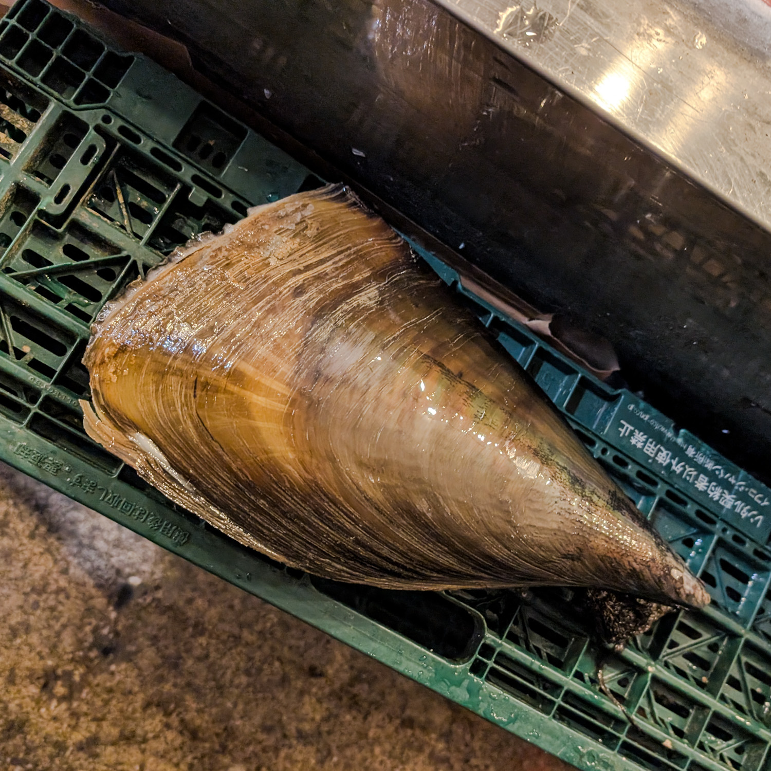 暖かい海に生息し、有明海や瀬戸内海、三河湾などが主な産地。水深5〜20mほどの砂地に突き立つように生きている大型の貝で、旬は冬の1〜3月とのことでした。