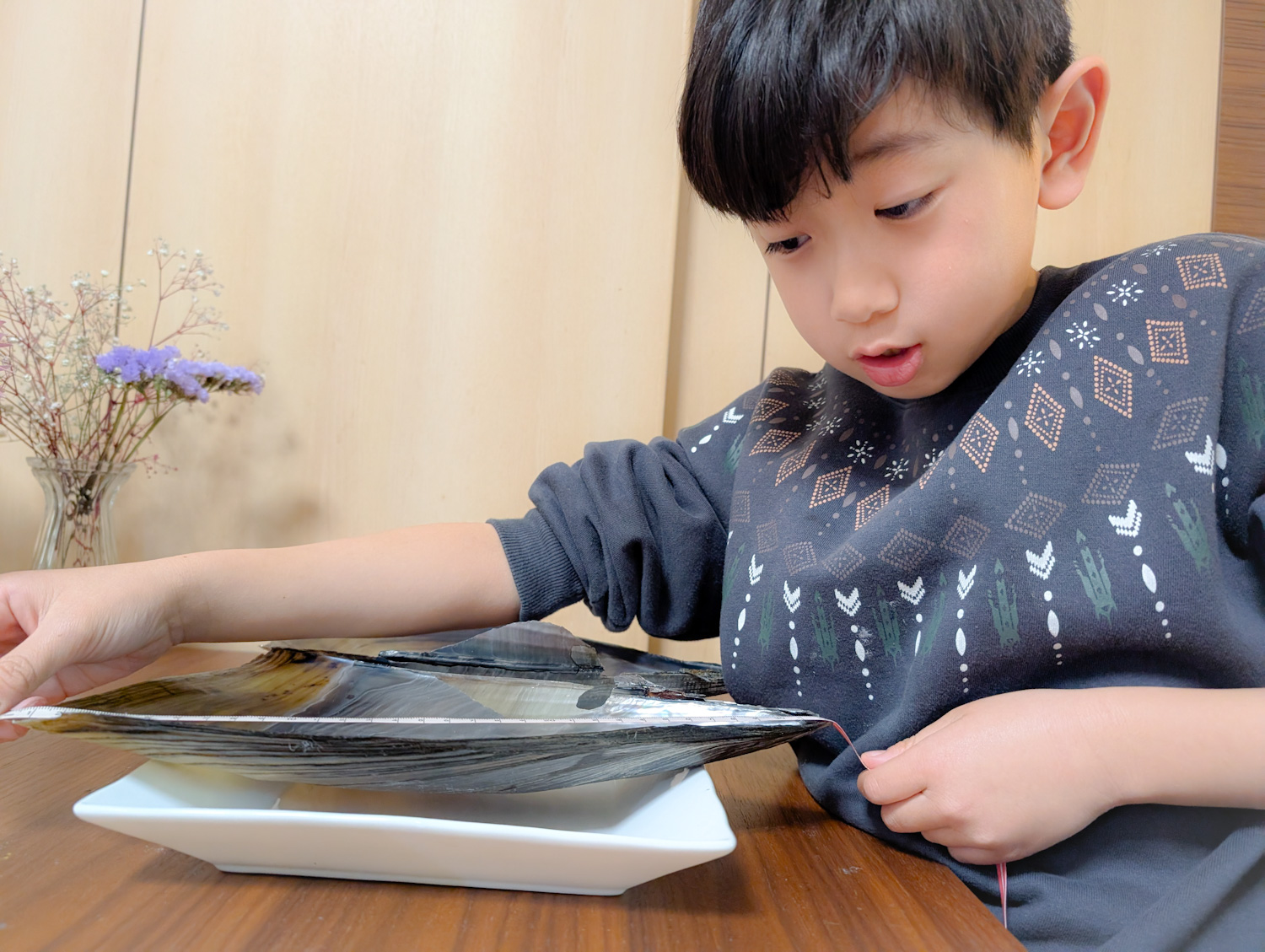 タイラギは先端部分を処理し、小さな貝柱を外してから開くそうです。手際よくさばかれてい く様子に、息子も興味津々でした。