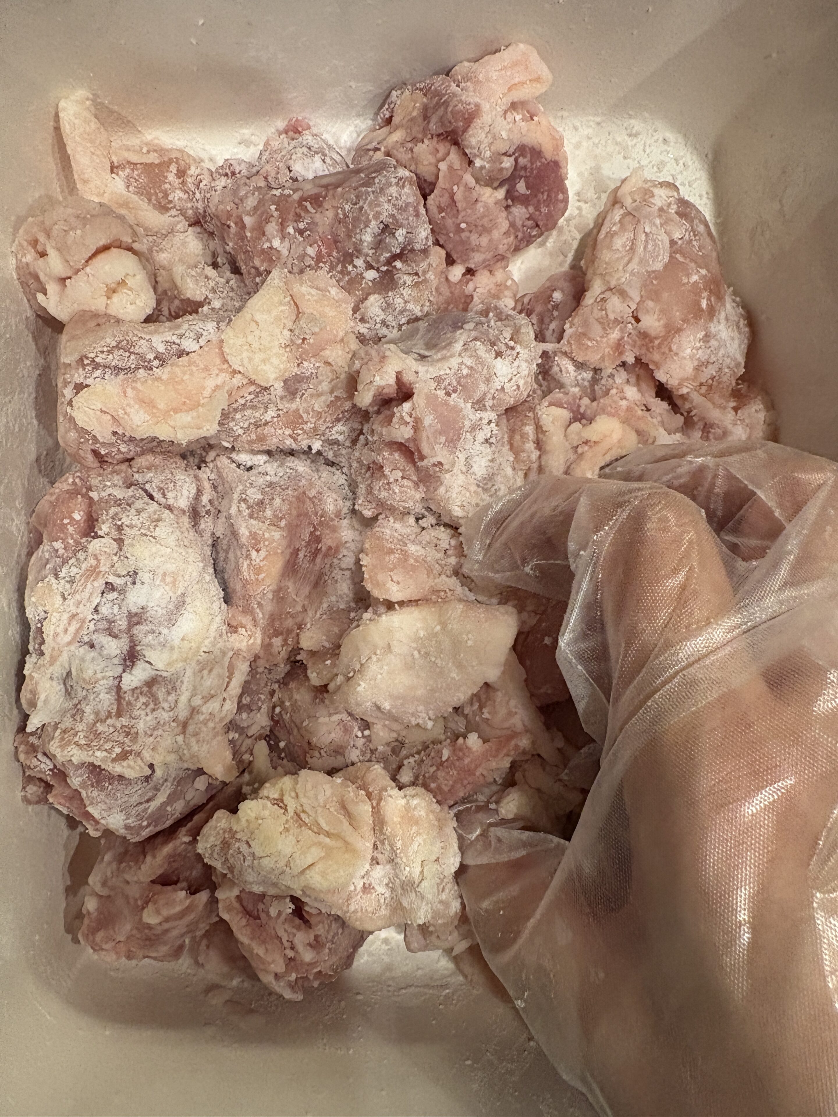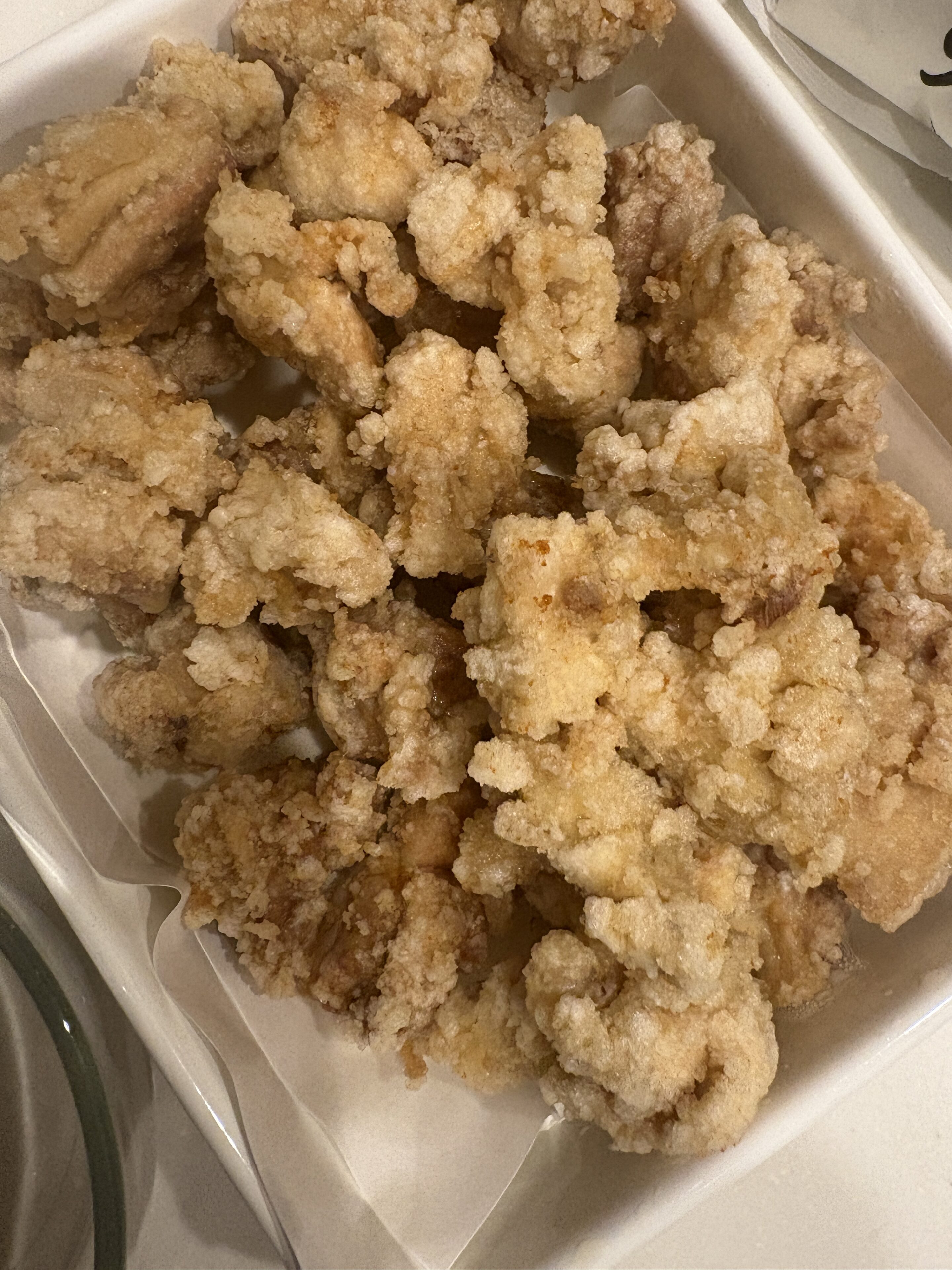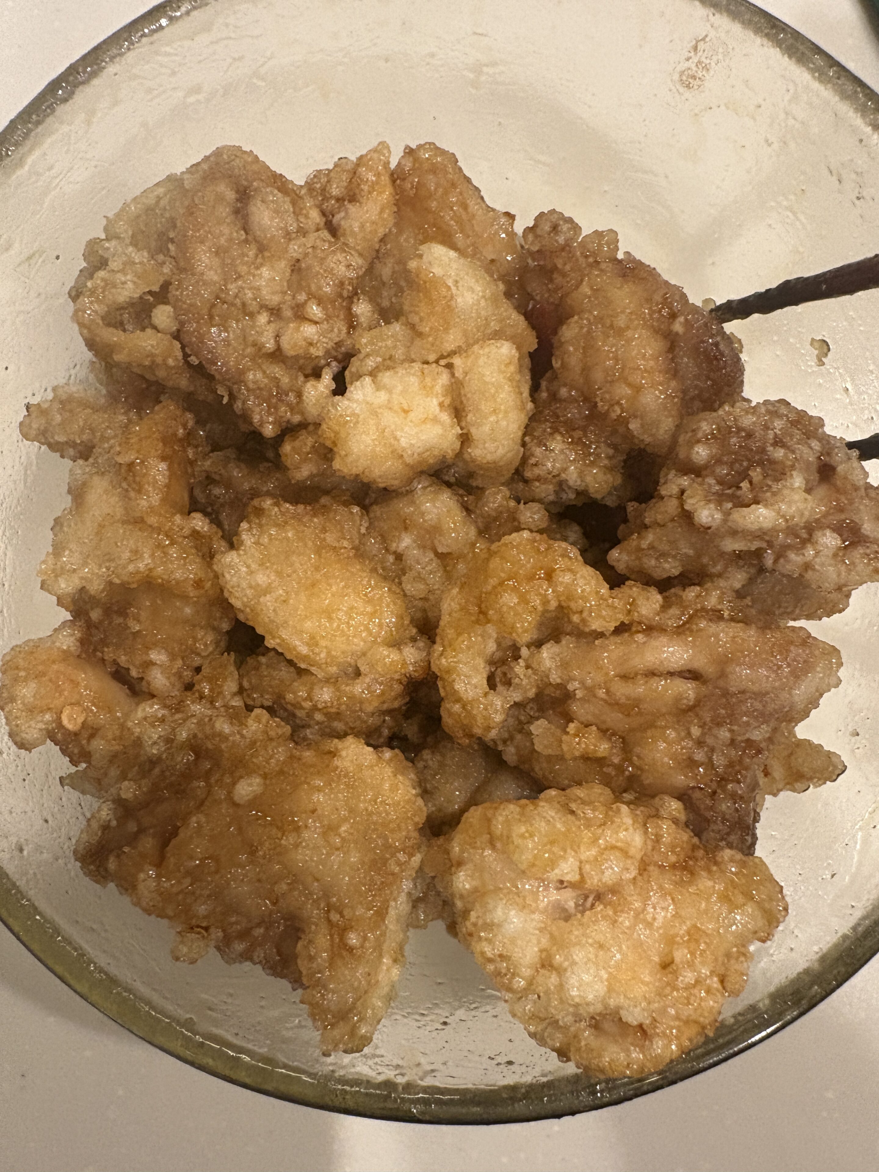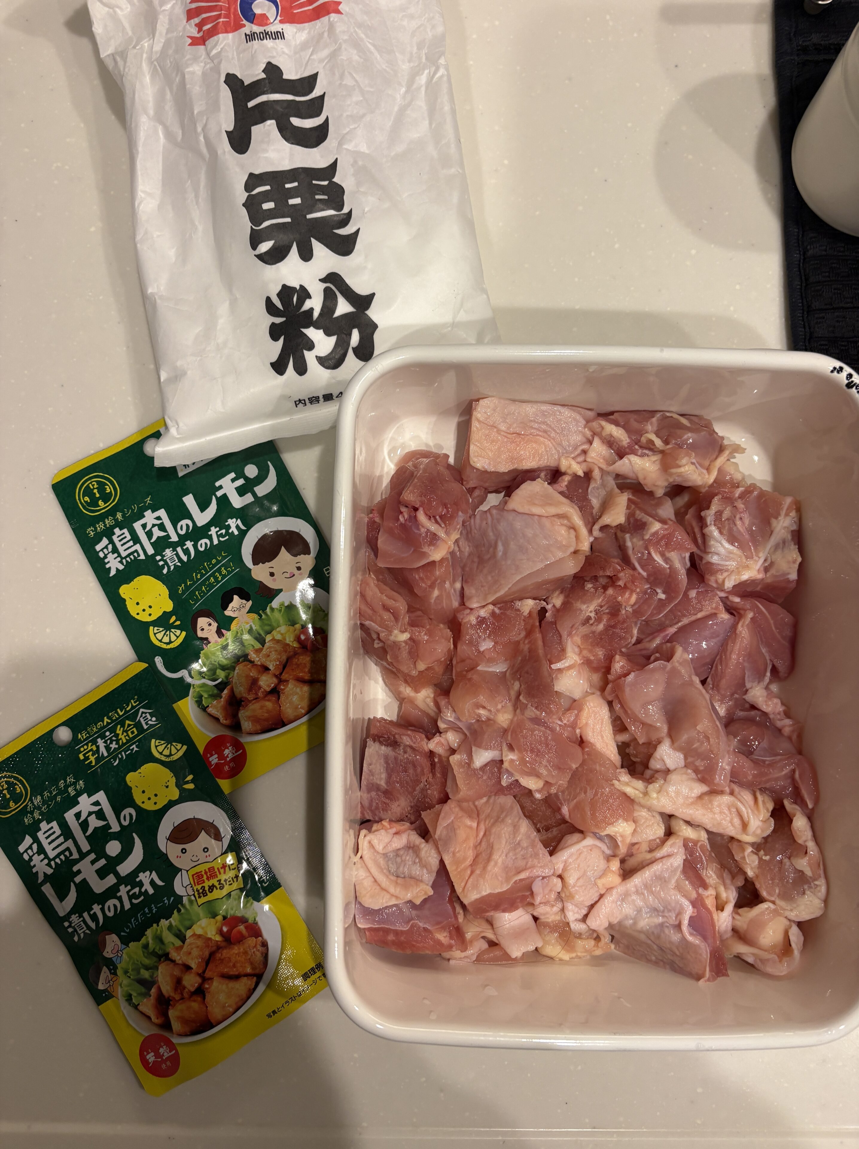 鶏肉に片栗粉をあえて揚げたものにかけるだけ。