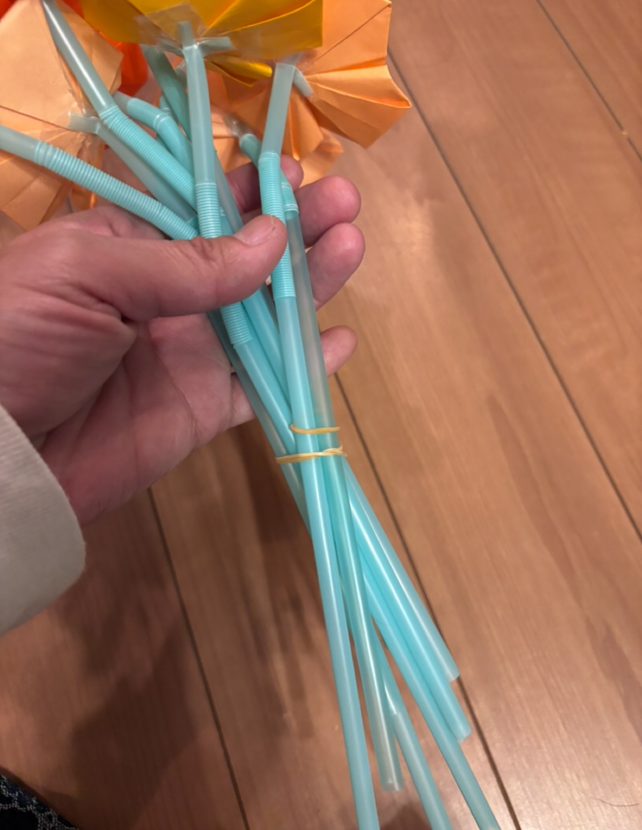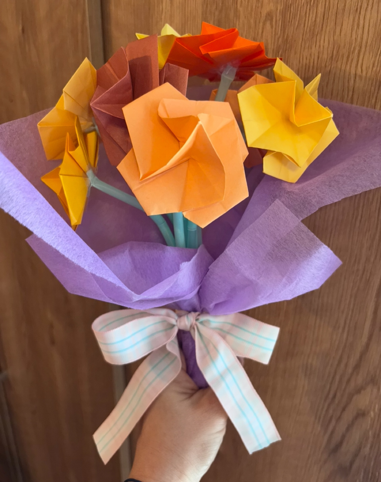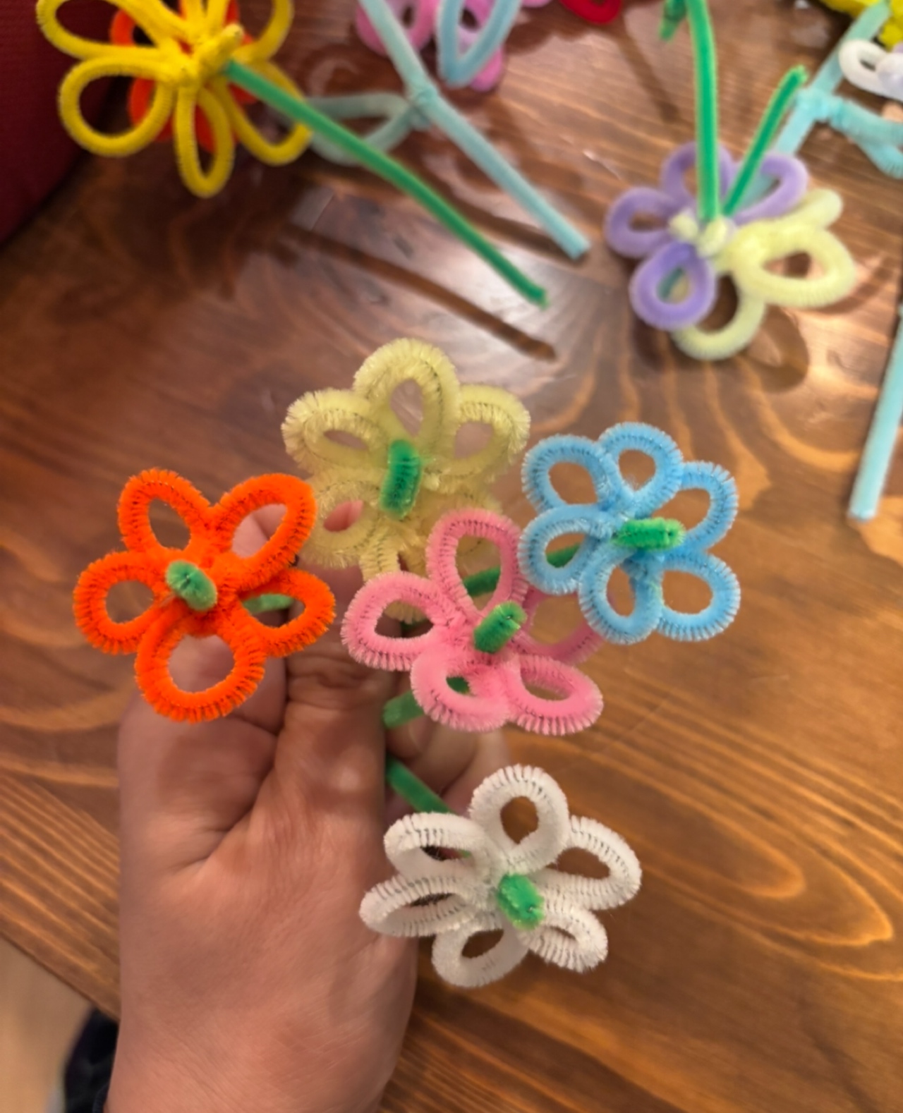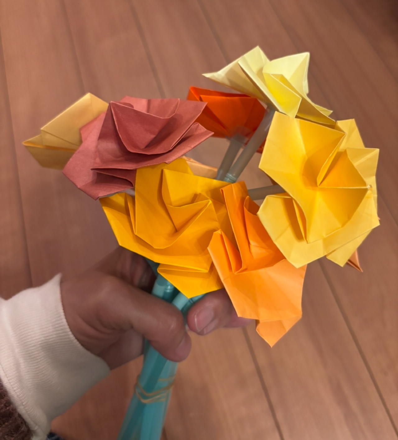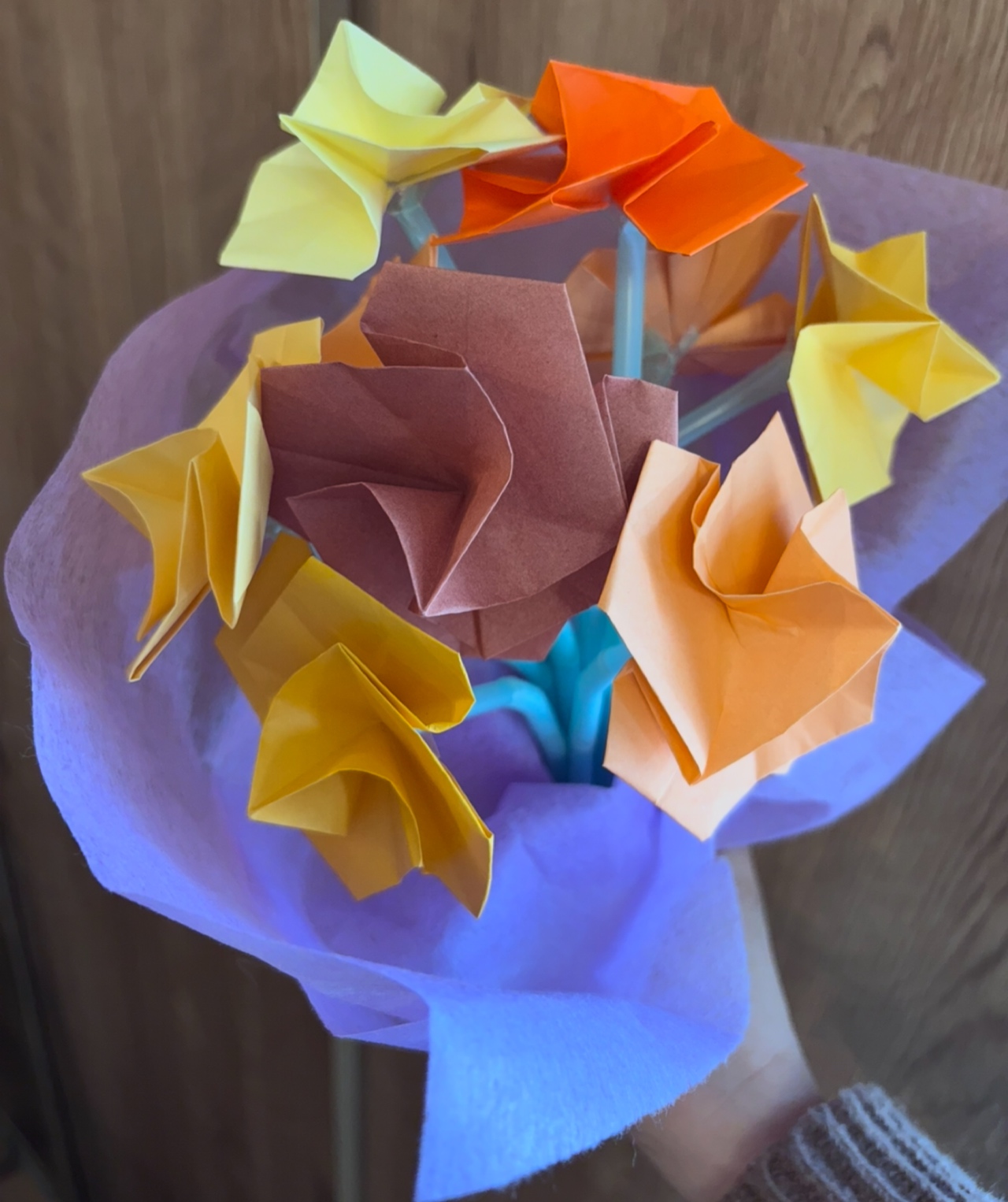 折り紙や、モールを使ってお花を作るやり方はいくつかあると思うのですが、それを花束にしたら素敵ではないかな!?と思い、子供達と作ってみました。