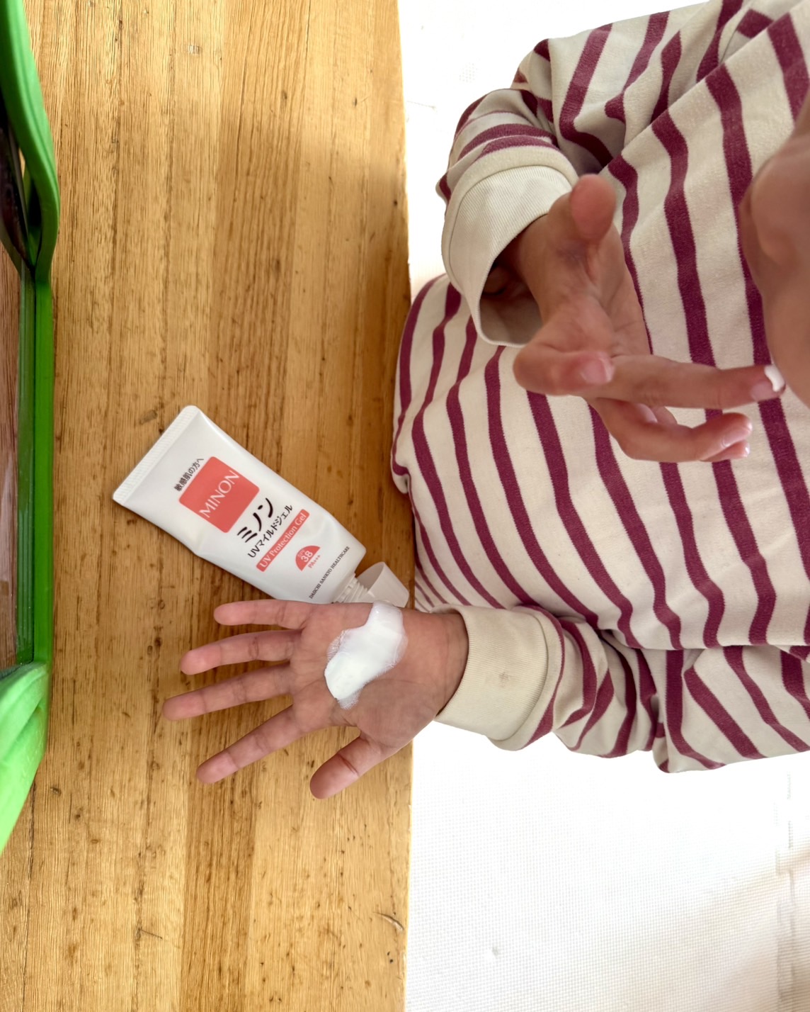 そして、これから紫外線が気になる季節。この流れなら、日焼け止めも自分から塗ってくれるのでは…?と、ひそかに期待していたところ、大成功をおさめました!