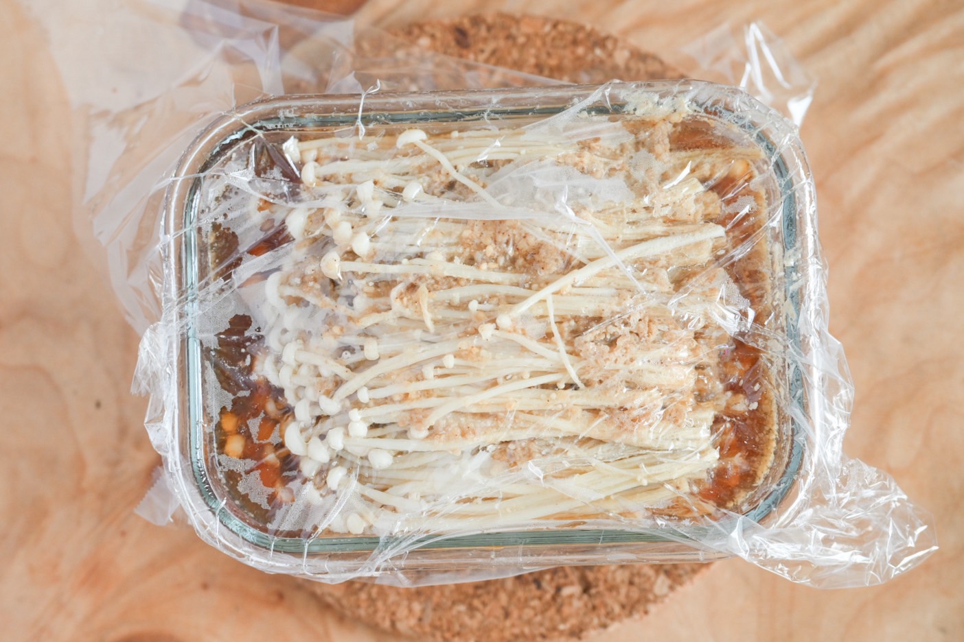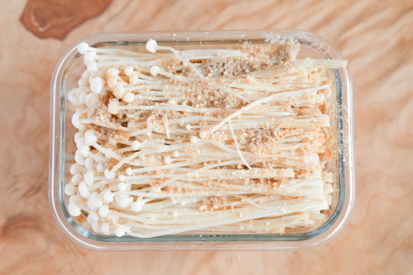 (2)耐熱容器にえのきだけと漬け用たれを入れます。