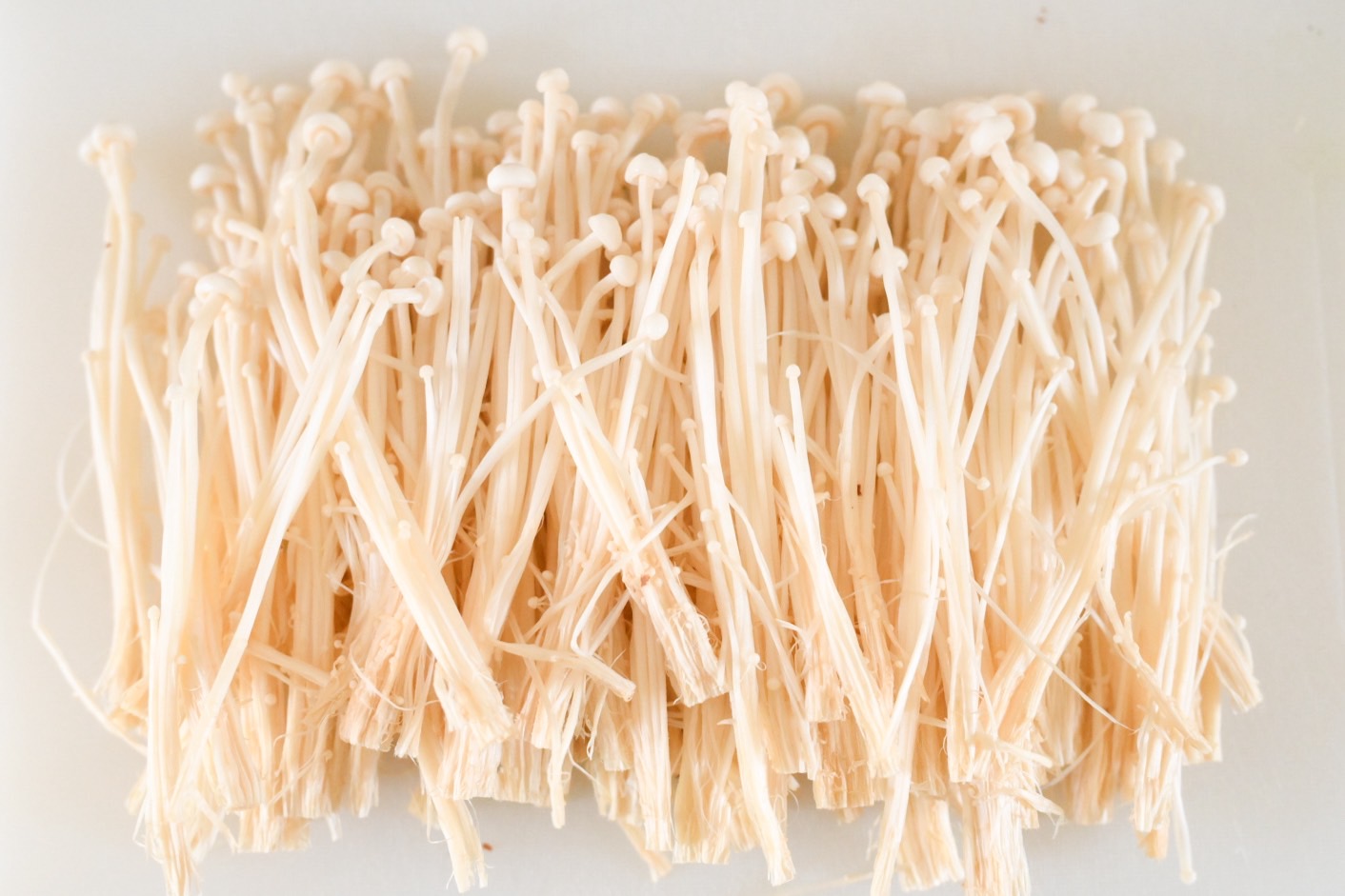 (1)えのきだけは石づきを切り落とし、小房にわけます。