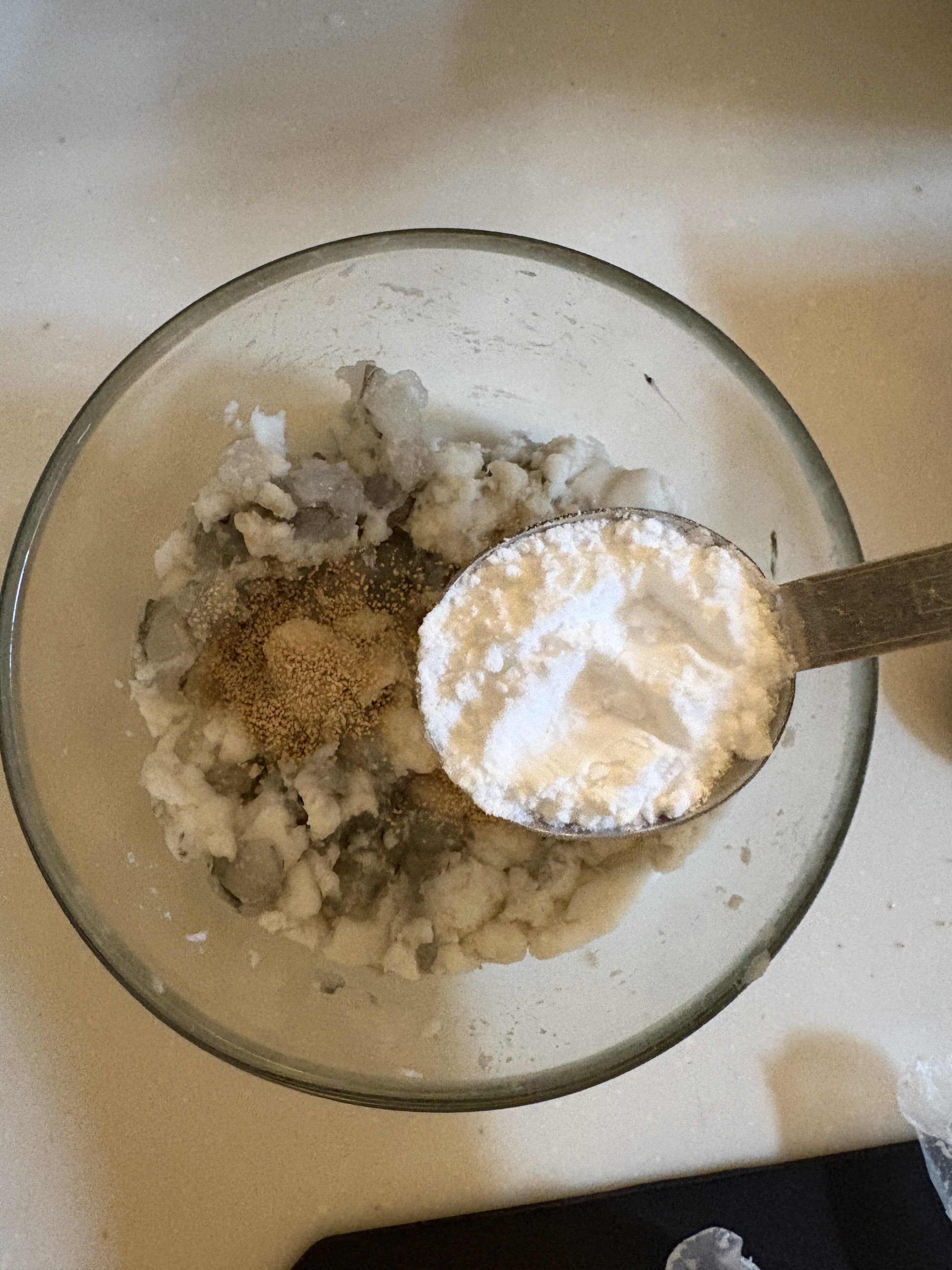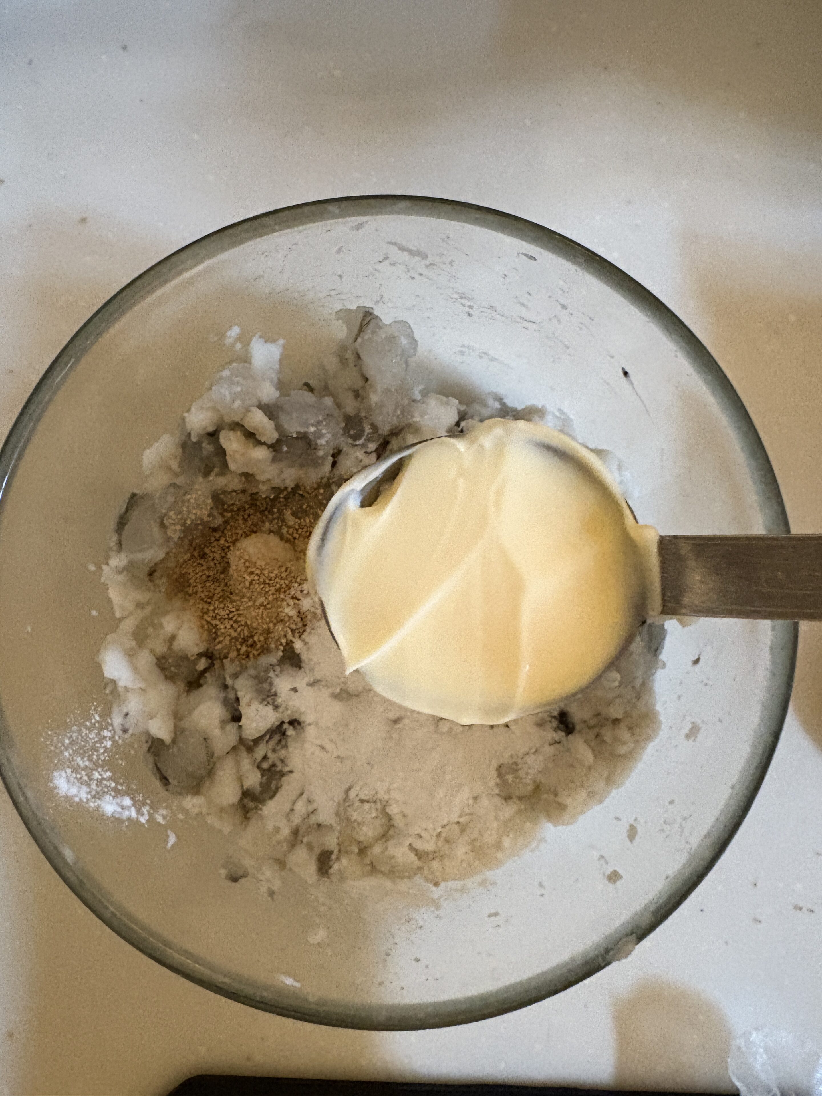そこに顆粒出汁小さじ1、片栗粉大さじ1、マヨネーズ大さじ1を合わせて混ぜます。