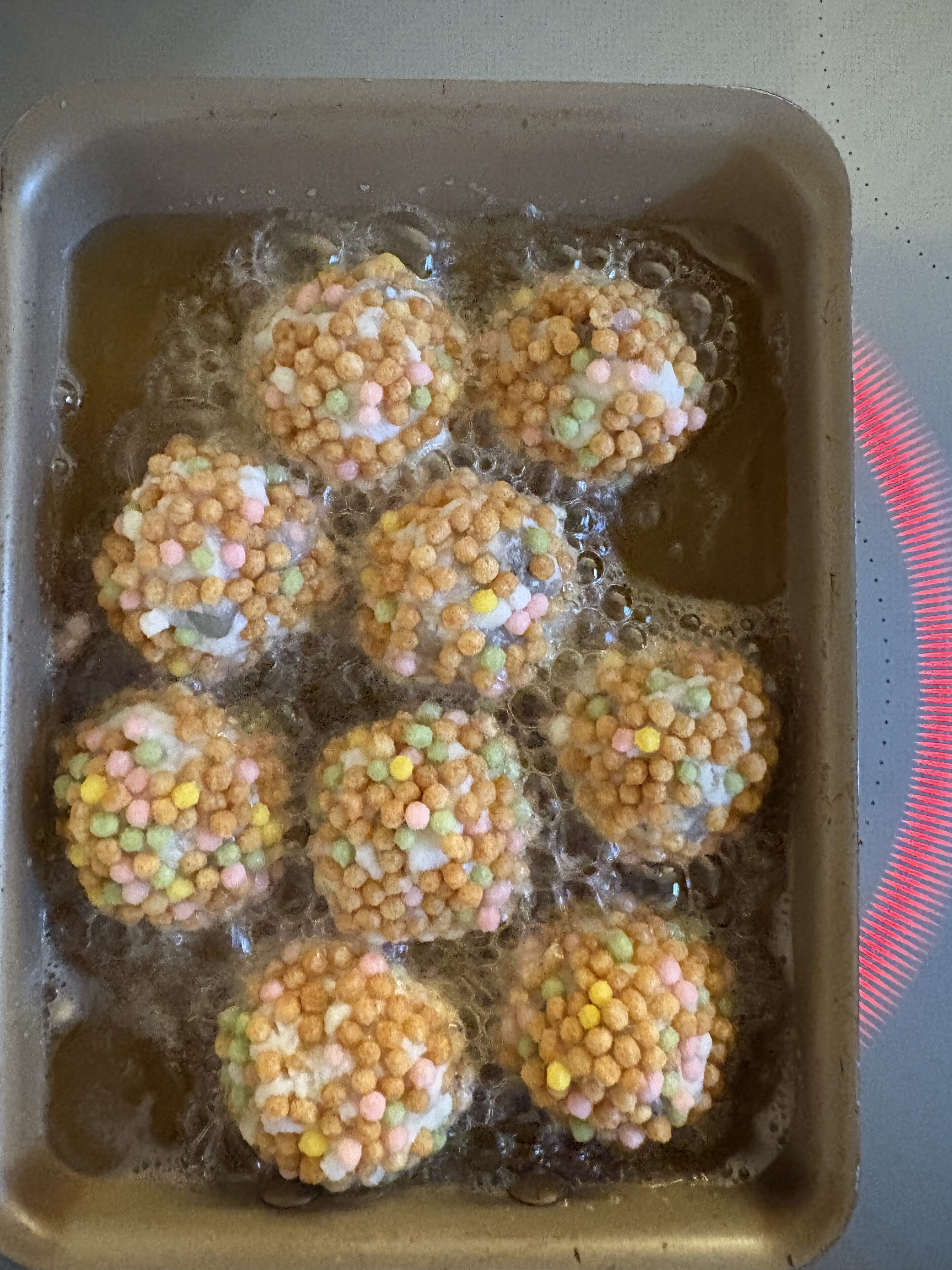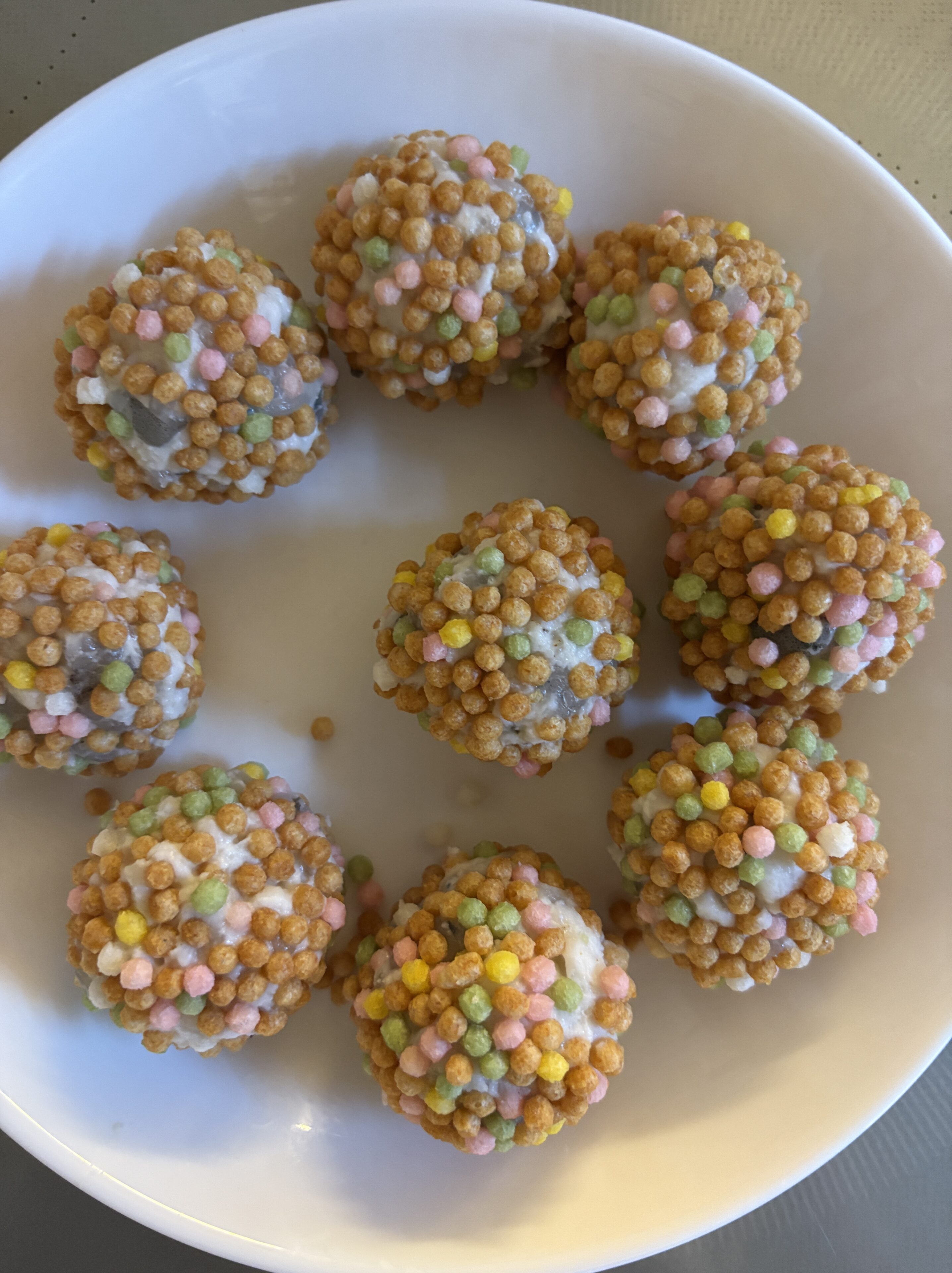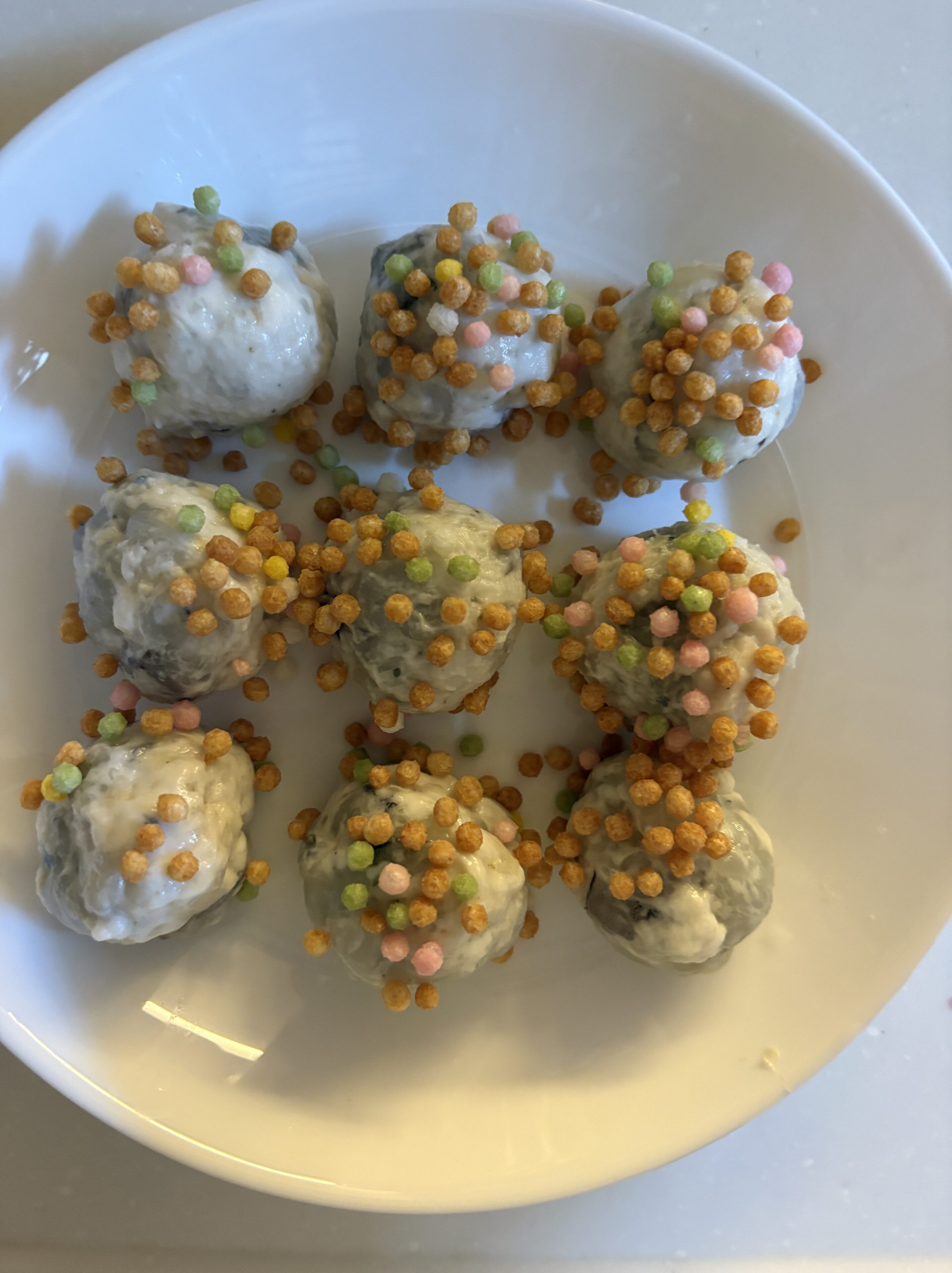 濡らした手で丸めるとやりやすいです。それに【ふりふりあられ】をまぶしてつけます。多く付けたかったら2袋分使います。