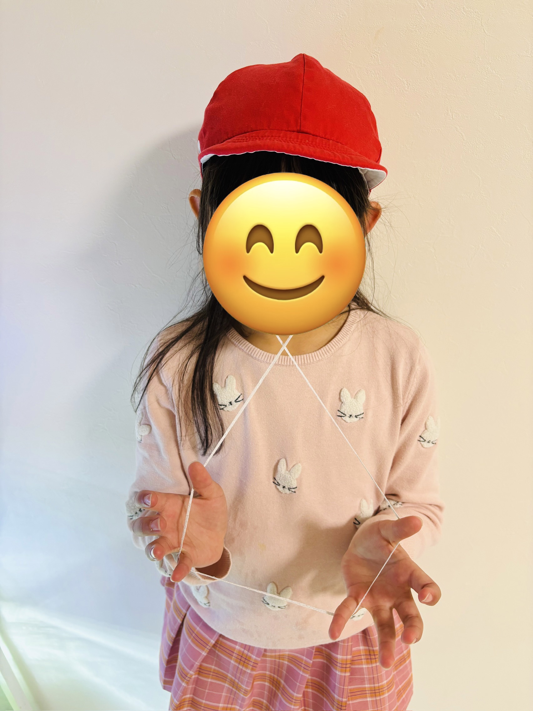 その後、一度帽子を外して、頭の上にゴムを乗せて、その上から帽子をかぶると普通のかぶり方と変わらないと娘は得意げでした。
