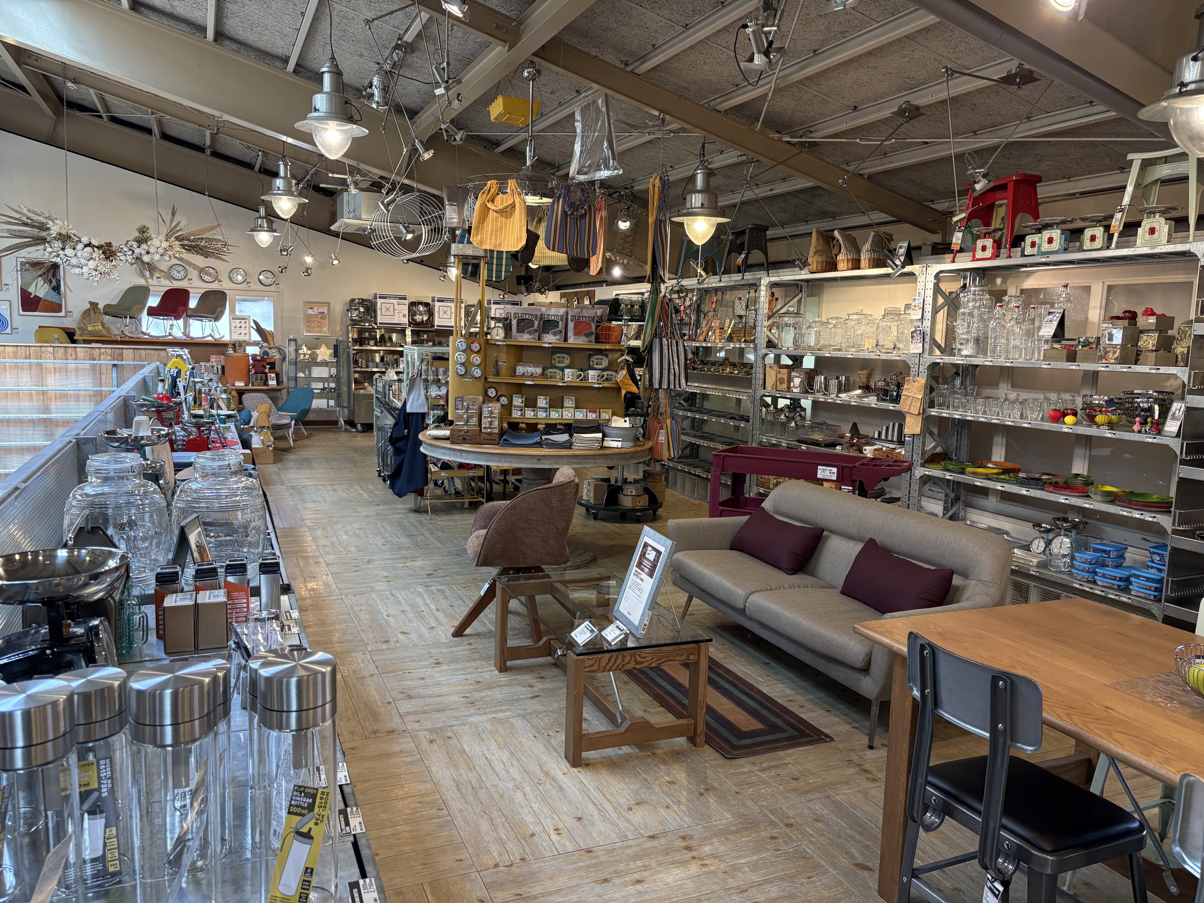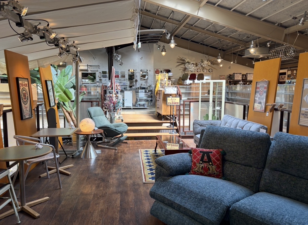 家具・キッチン雑貨・ガーデニング用品・工具など、ジャンルも幅広く、まるで海外のガレージや映画の世界に迷い込んだような空間。