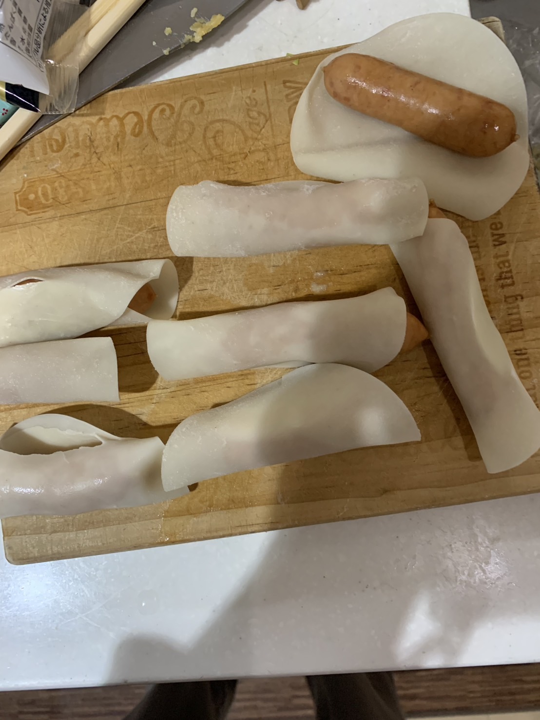 ウインナーを餃子の皮でまいて、巻き終わりを水をつけてとめます。