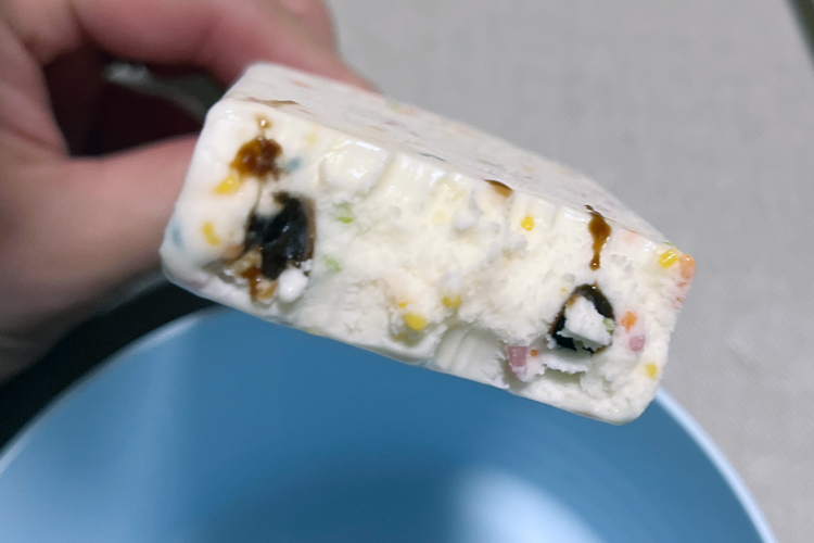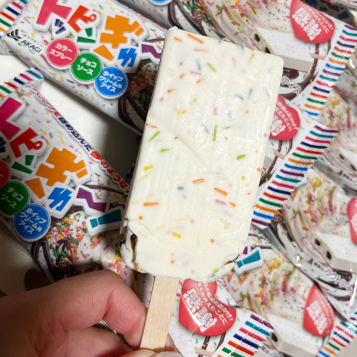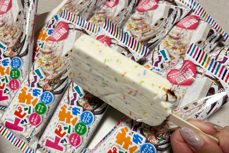 しかも驚くほどのカラースプレーの量で、まさに“てんこ盛り”。一見かなり甘そうに見えますが、実際は意外とさっぱりした後味。アイス自体は少ししっかりめの食感で、お風呂あがりにもぴったりだと感じました。