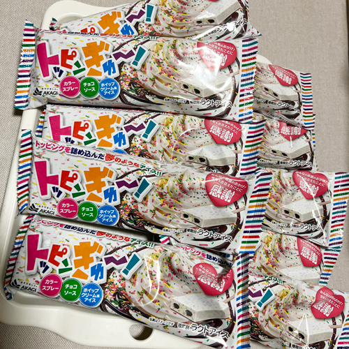 その日もいつものように立ち寄ったところ、ひときわ目を引く派手なパッケージのアイスを発見しました。それが「トッピンぎゅ~!」です。