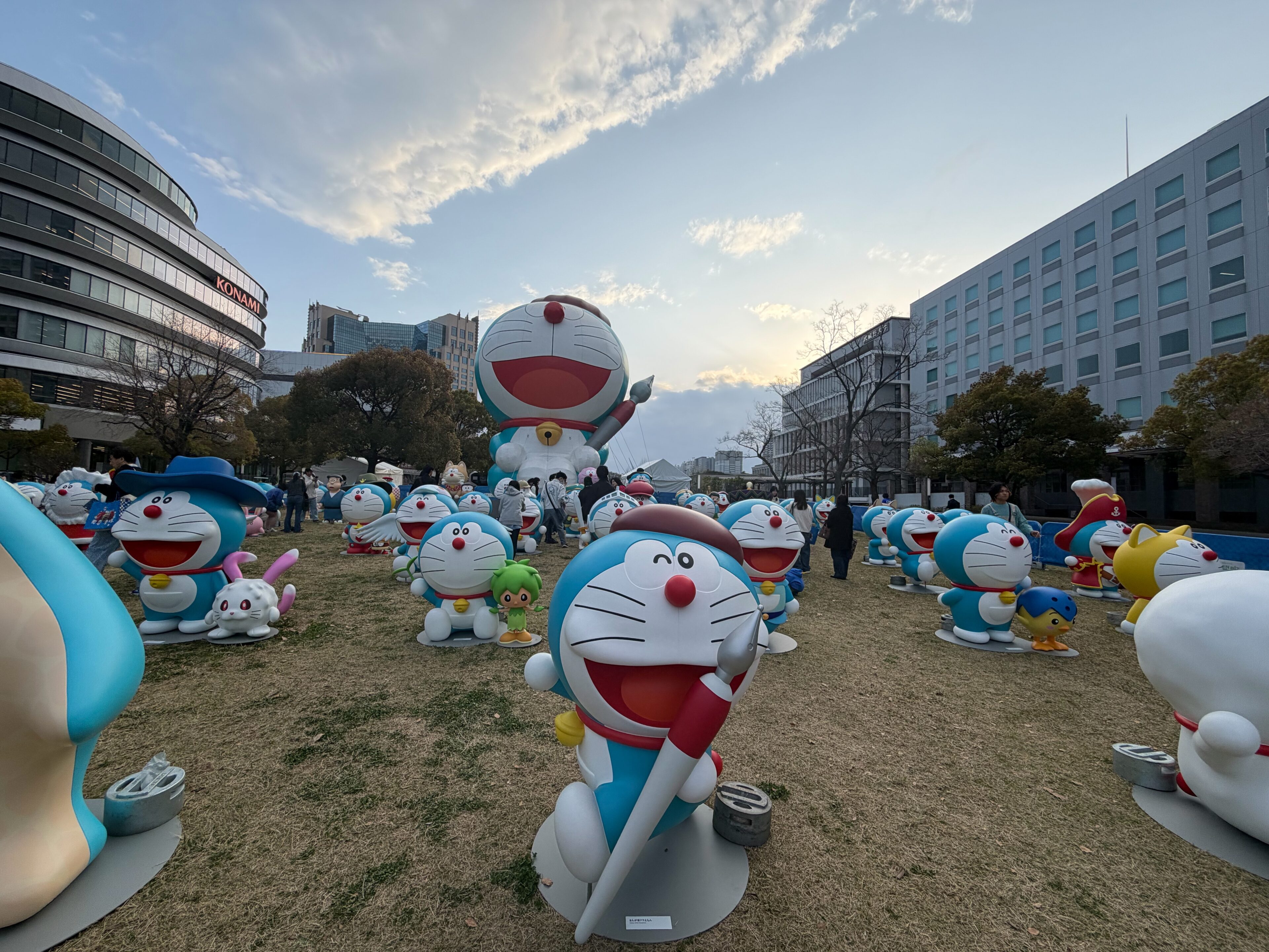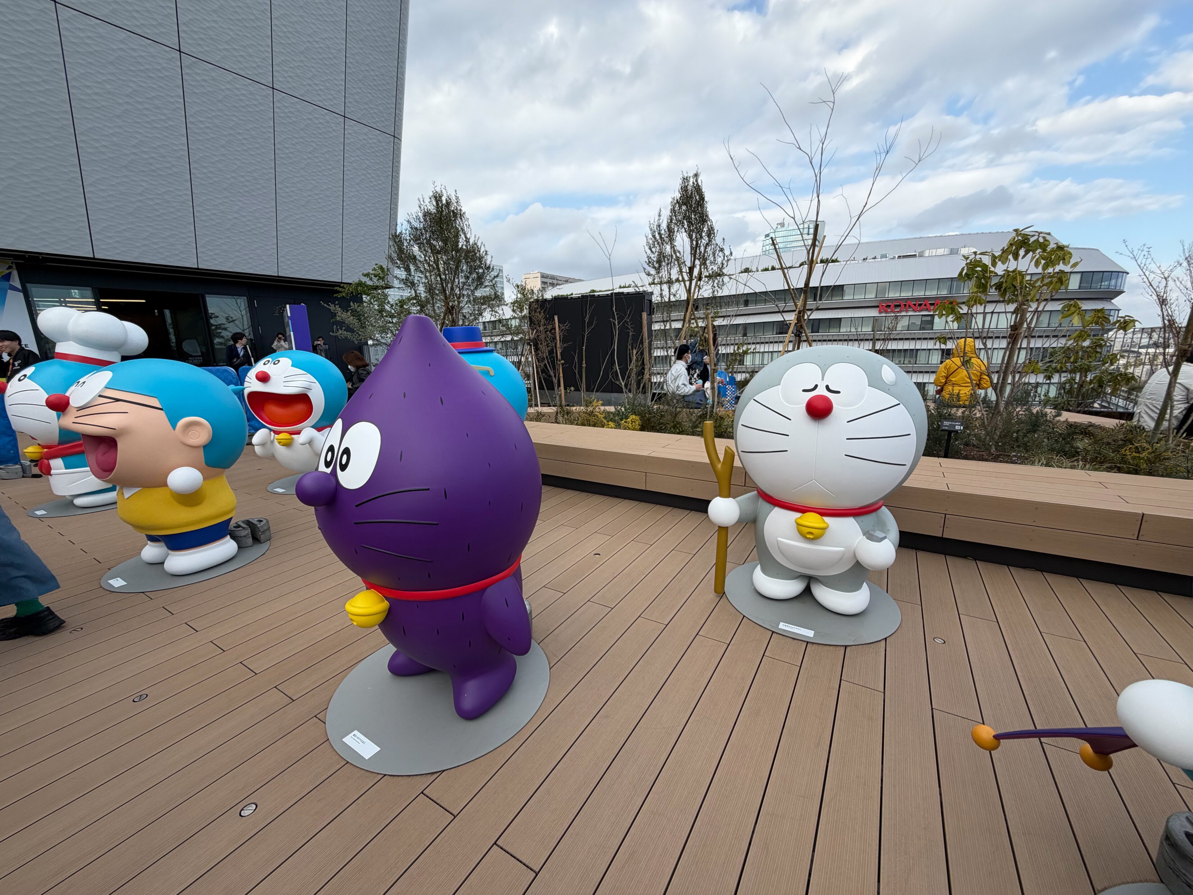 展示を楽しんだあとは、同じ6階の「ドリームテラス」へ。ここではオリジナルの等身大ドラえもんが10数体展示されていて、すぐ近くで一緒に写真撮影ができます。屋外の開放的な空間で、ちょっとした休憩にもぴったりでした。
