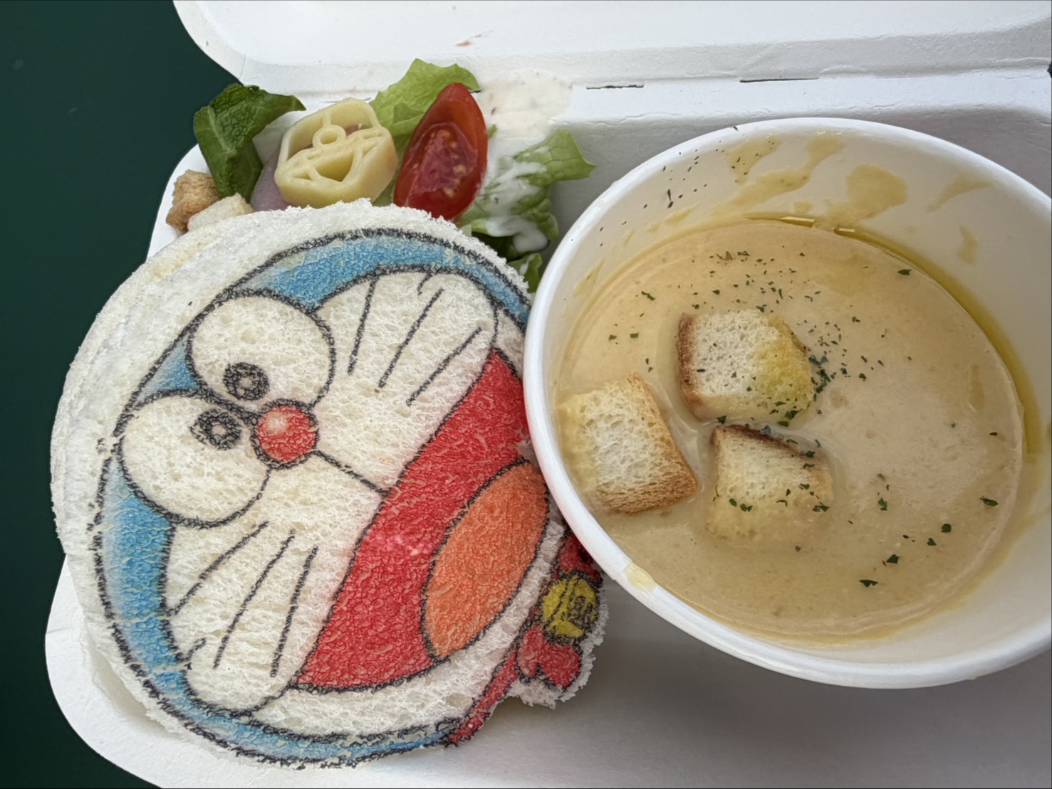 「100%ドラえもん」のたまごサンドボックスをいただきましたが、ひみつ道具「100%友達あつめすず」をつけたドラえもんの顔がプリントされていて、とても可愛い仕上がりでした。サラダに入っているマカロニもよく見るとドラえもんの鈴の形になっていて、細かい遊び心に子どもたちも大喜び!テラスで心地よい風を感じながら食べるランチは、とても気持ちよくおすすめです。