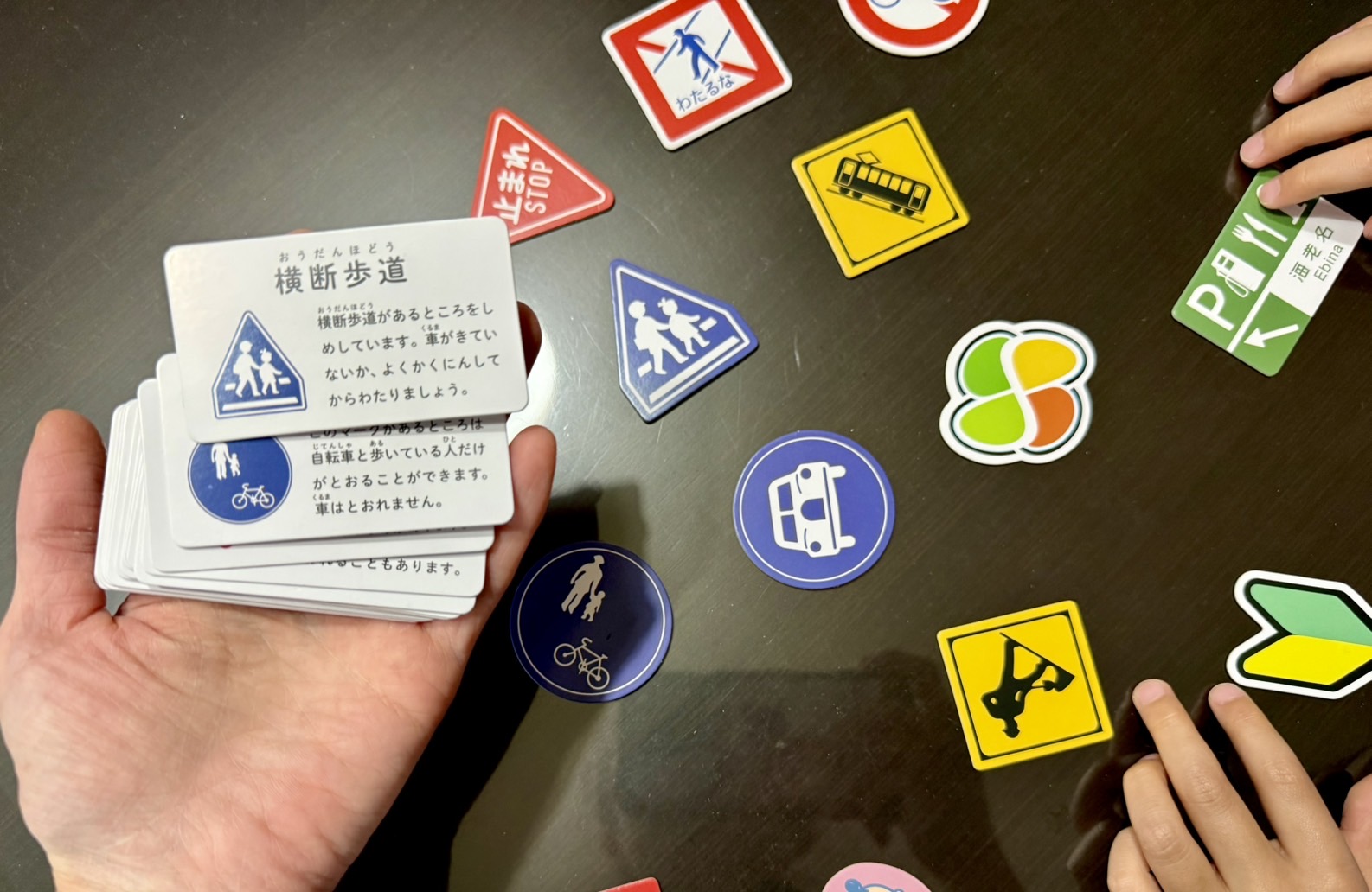 読み札にはすべてふりがなが付いているので、息子も一生懸命読んでいました。大人も意外とうろ覚えだったことに気づかされ、「これ見たことある!」「これってどういう意味?」と、親子で遊びながら自然と会話が生まれ、標識がぐっと身近な存在になりました。