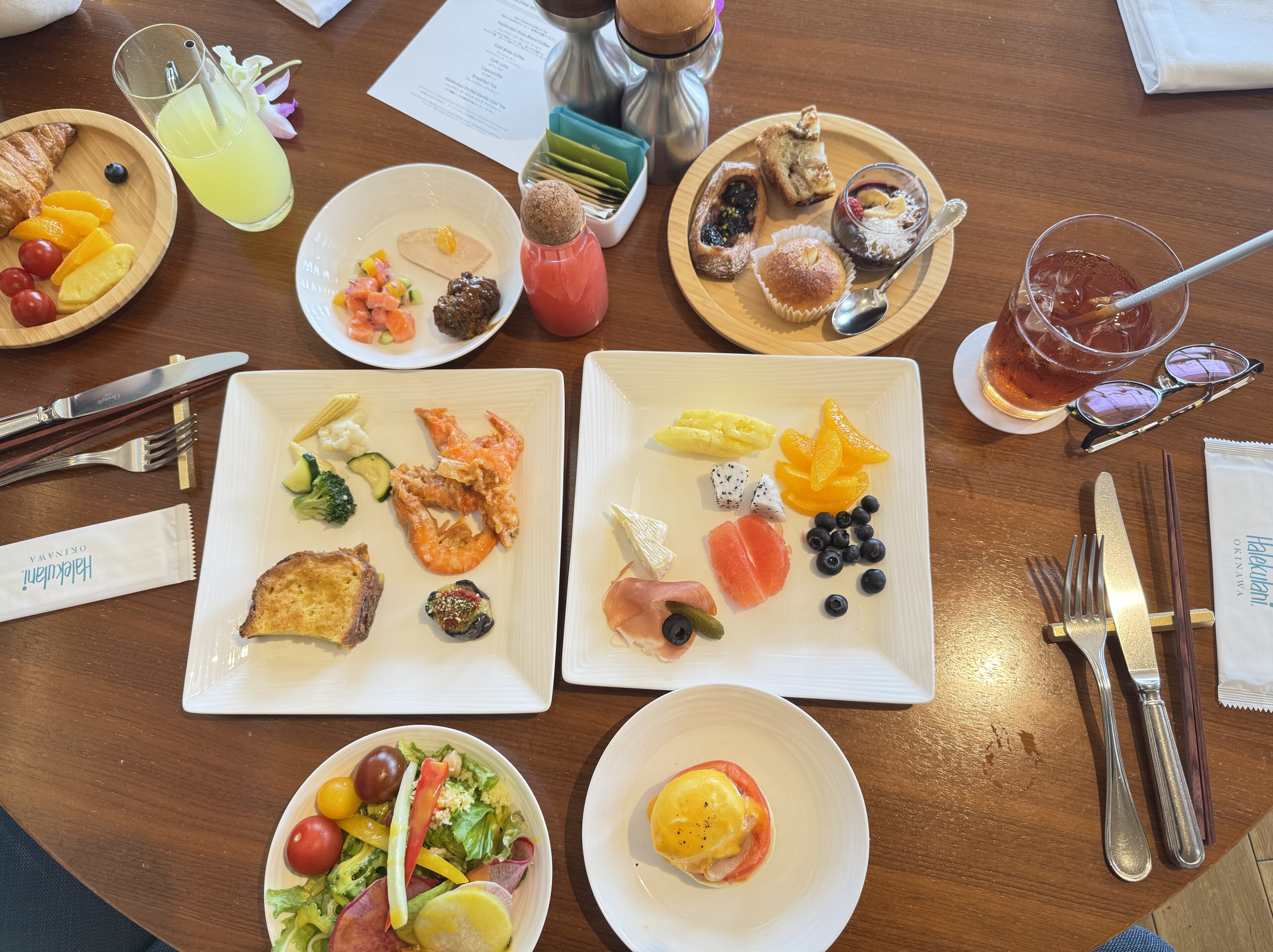 沖縄料理、名物のエッグベネディクト、焼きたてのパン、サラダ、フルーツ、スムージー、デザート、黒糖アイスなど、どれもこれも美味しかったです!
