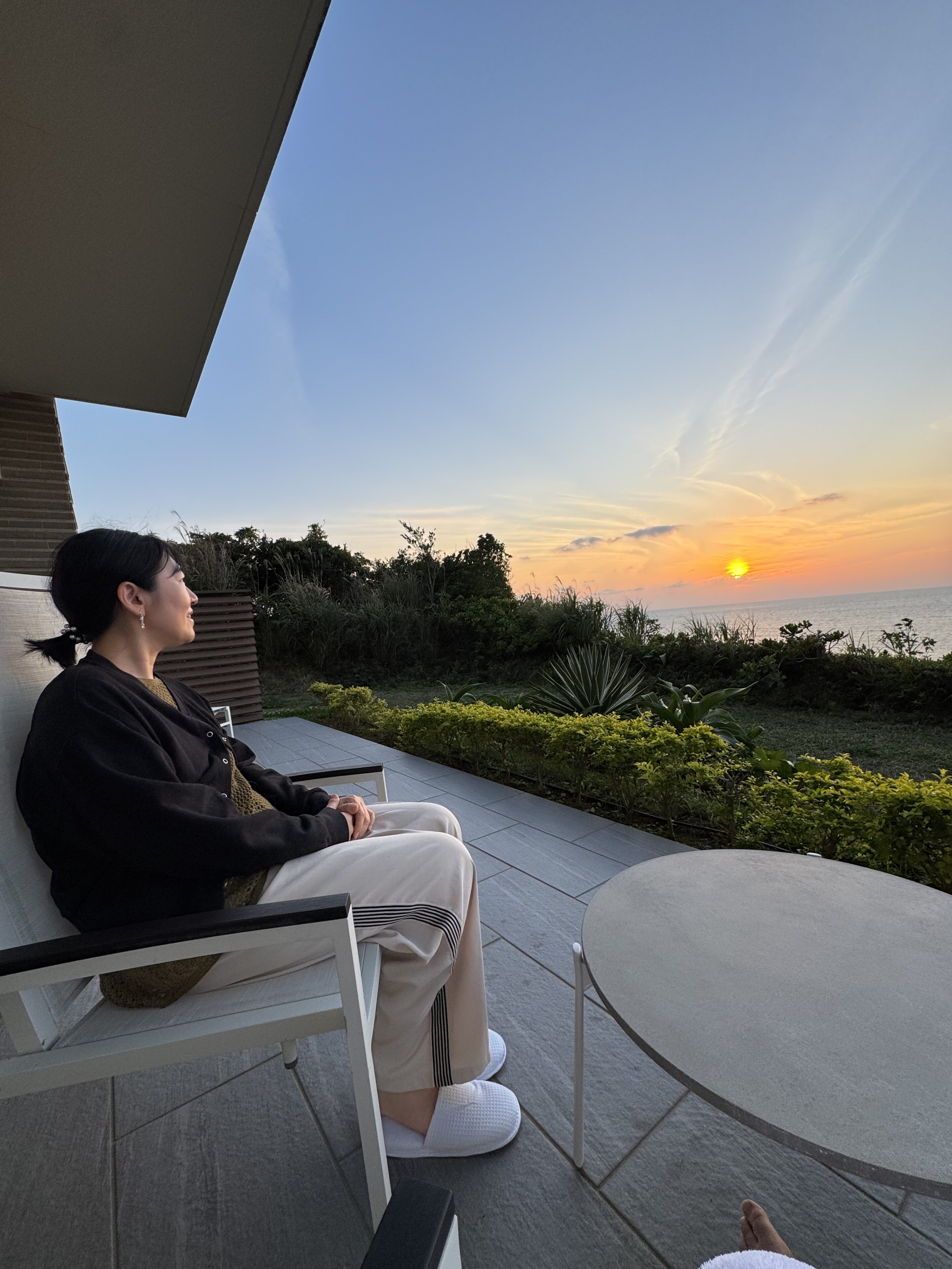 ぎゅうぎゅうでやや睡眠不足の私でしたが、部屋のテラスからサンセットを眺められ、朝起きたら目の前は沖縄のきれいな海、心は癒されました。寝返り打てず、体はバキバキでしたけどね(笑)。