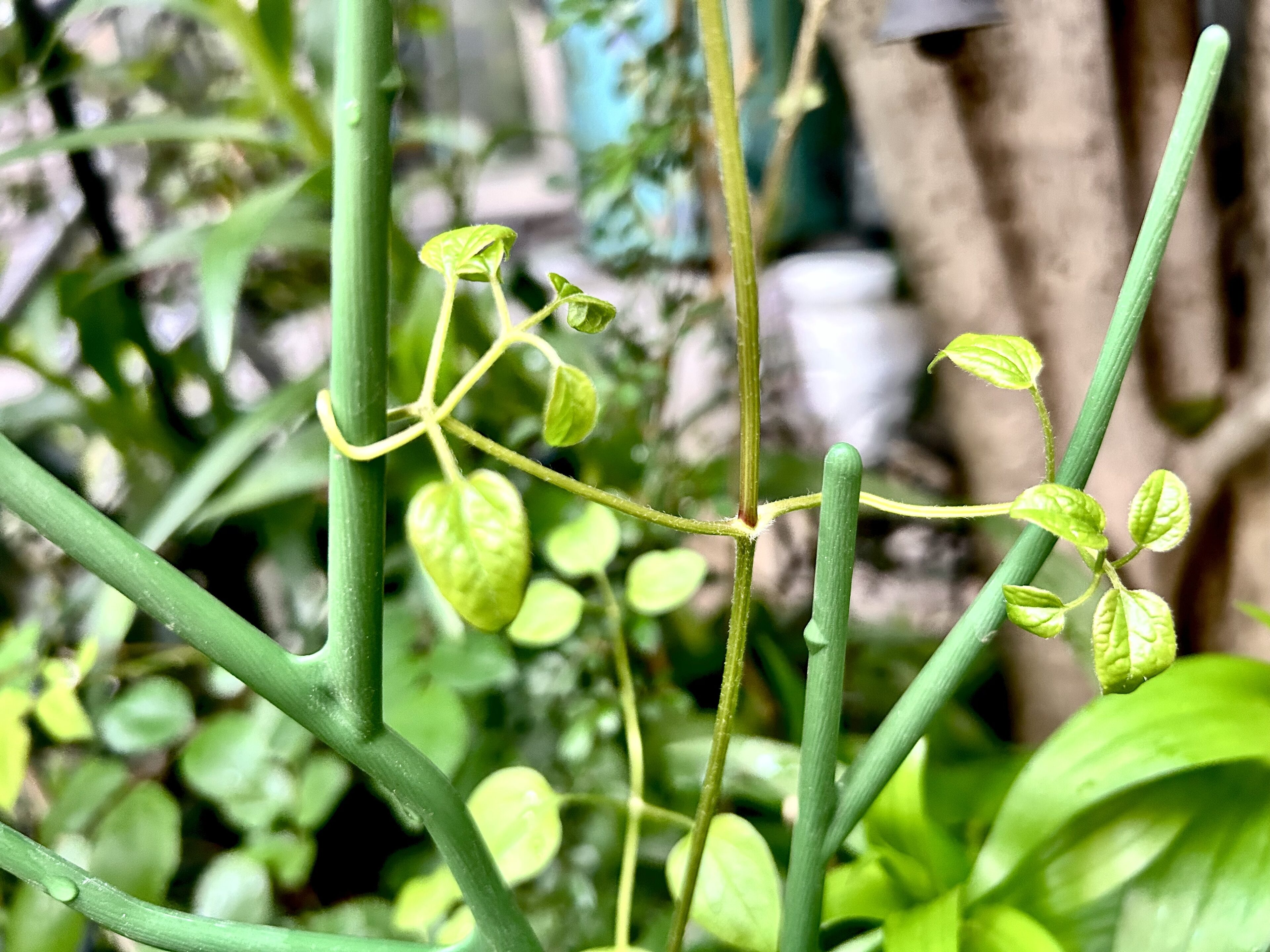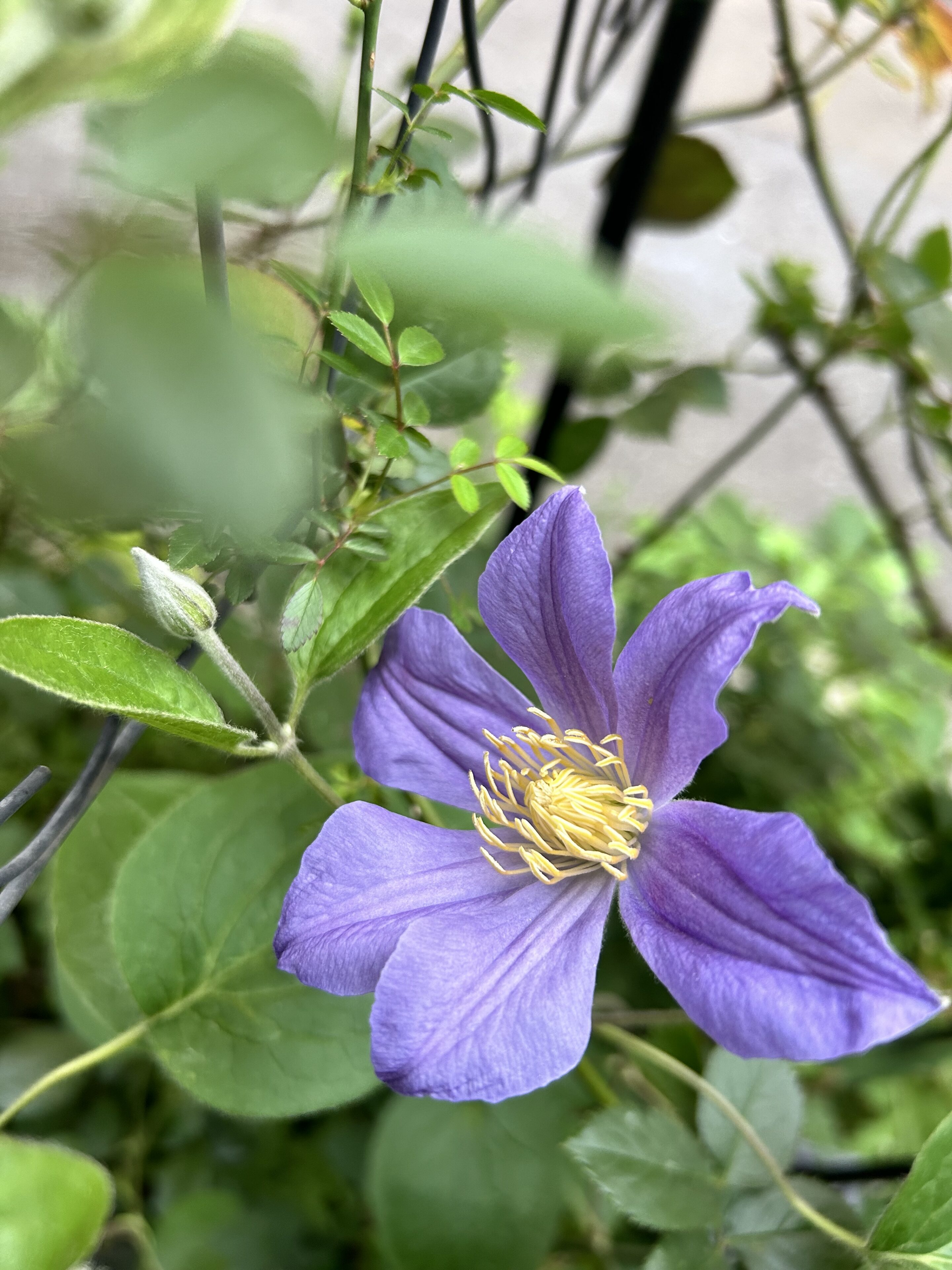 バラはこちらでしっかり誘引してあげないと暴れる特性があるのに対し、クレマチスは自力でつるを伸ばし、葉っぱで優しくギュッ!と握りしめて(カワイイ!)