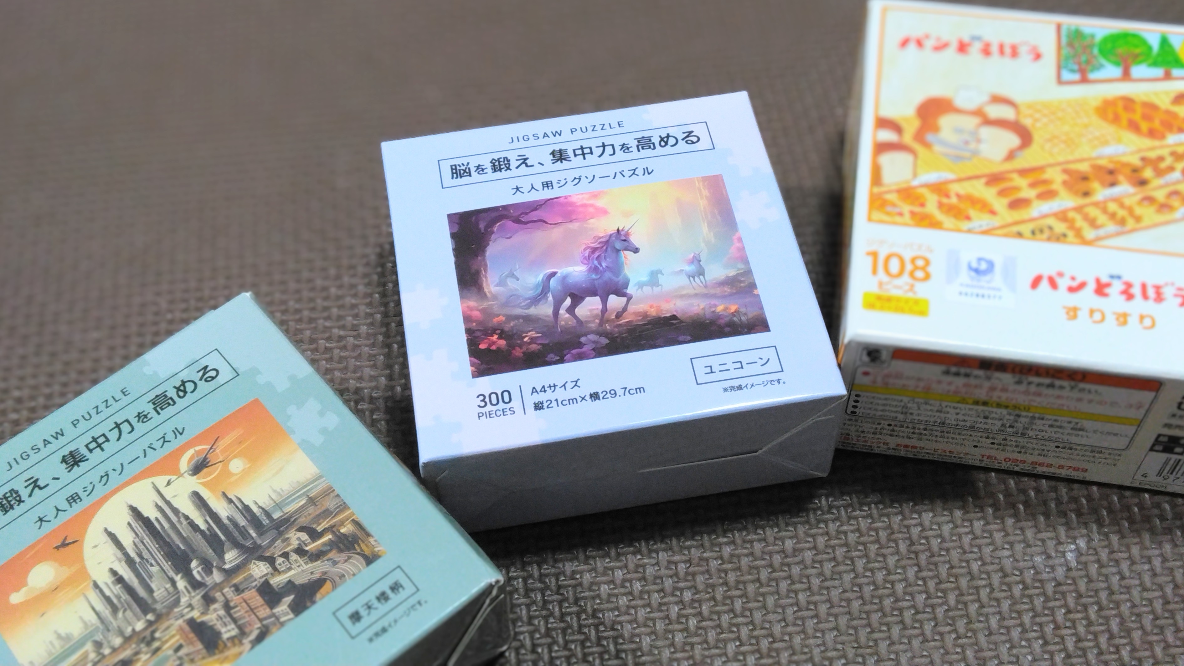 「両手が塞がる」ことがリフレッシュ効果につながる、と雑誌で読んだことがあります。便利な時代、なんでも「ながら作業」が叶ってしまうからこそ、「没頭する仕組み」が整っているジグソーパズルに魅力を感じました。なにかに没頭する親の背中は、わたしが子どもに見せたい姿のひとつでもあります。そんな気持ちを110円で叶えた、エピソードのご紹介でした。