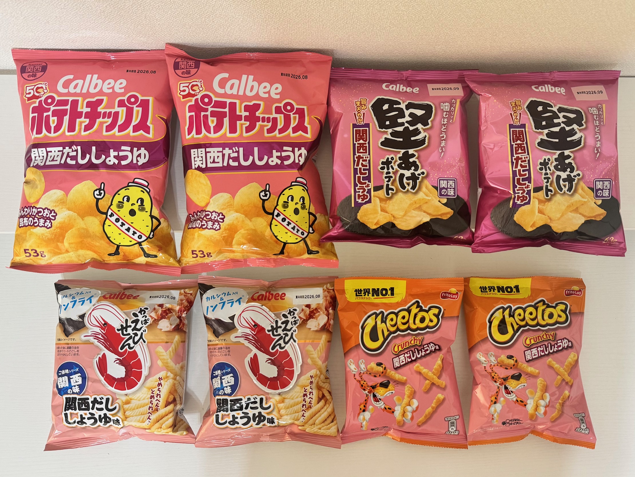 今回は、春休みに大阪に帰省した時に購入した、ポテトチップス・堅あげポテト・かっぱえびせん・チートスの4種類をご紹介します。どれも“だしのうま味”がポイントですが、実はそれぞれ味も食感もかなり違います。