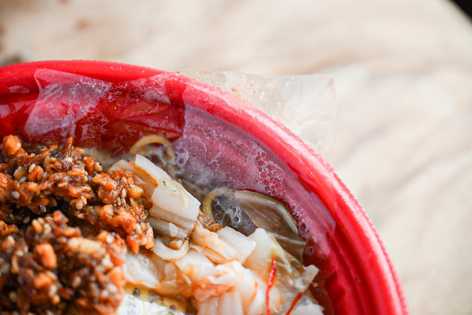 トッピングのフライドオニオンやローストアーモンドがたっぷり入った「食べる辣油」のザクザク食感がたまりません!