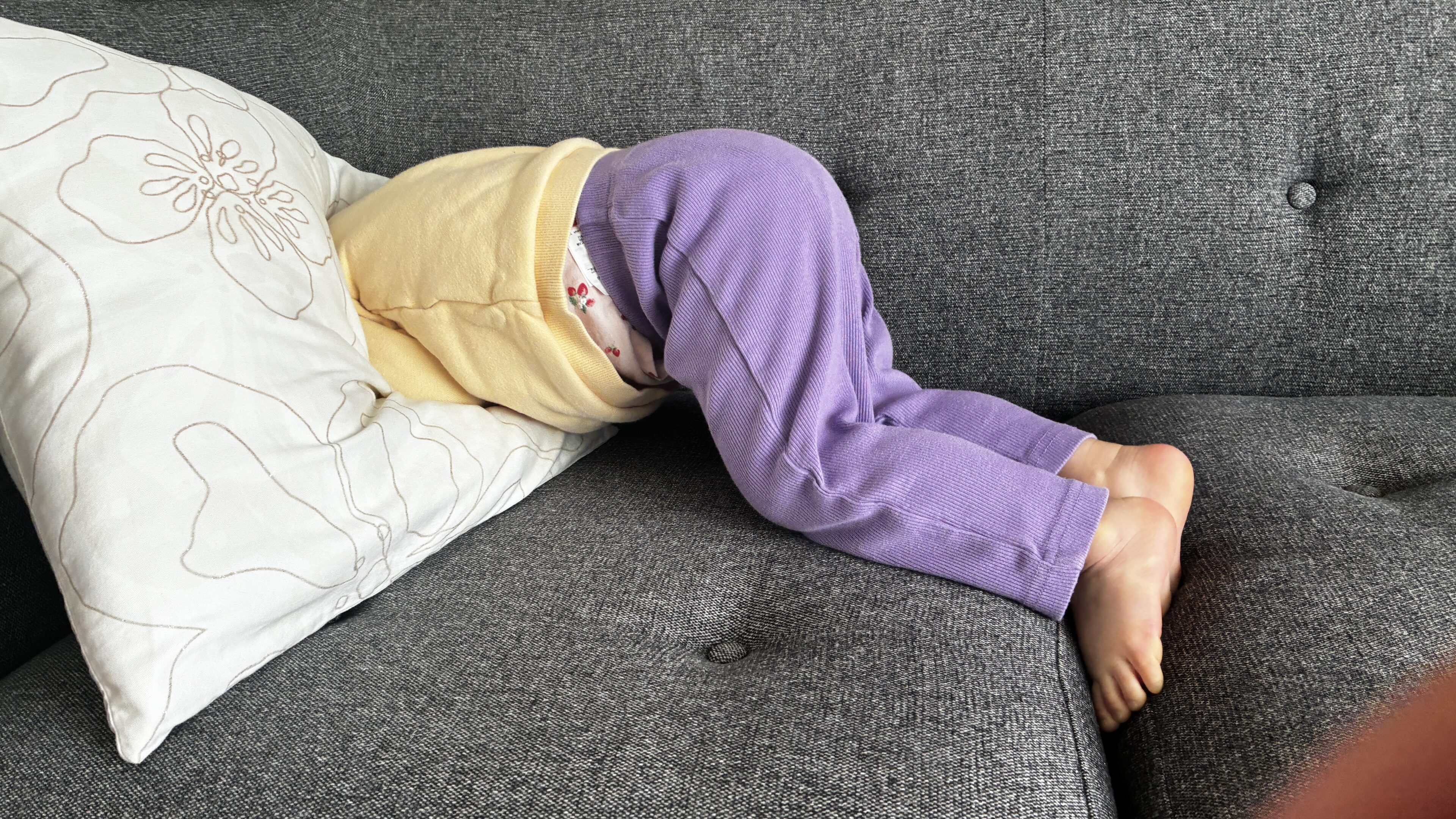 物理的にワサビを指に塗りました。多めに塗ったのでぜひ食べてほしかったのですが、塗った時点で既に拒否反応。そのまま服や髪に付けてしまい妻はカンカン。主に僕に。結局この方法は渋々諦めることにしました。ちなみに娘は、塗ったときの体験が割と嫌だったのか、その後「ワサビ塗るよ」と言うと逃げるそぶりを見せます。一定の効果はあった模様です。しかし逃げてソファに頭を隠すだけで、チュッチュはやめないのでした。