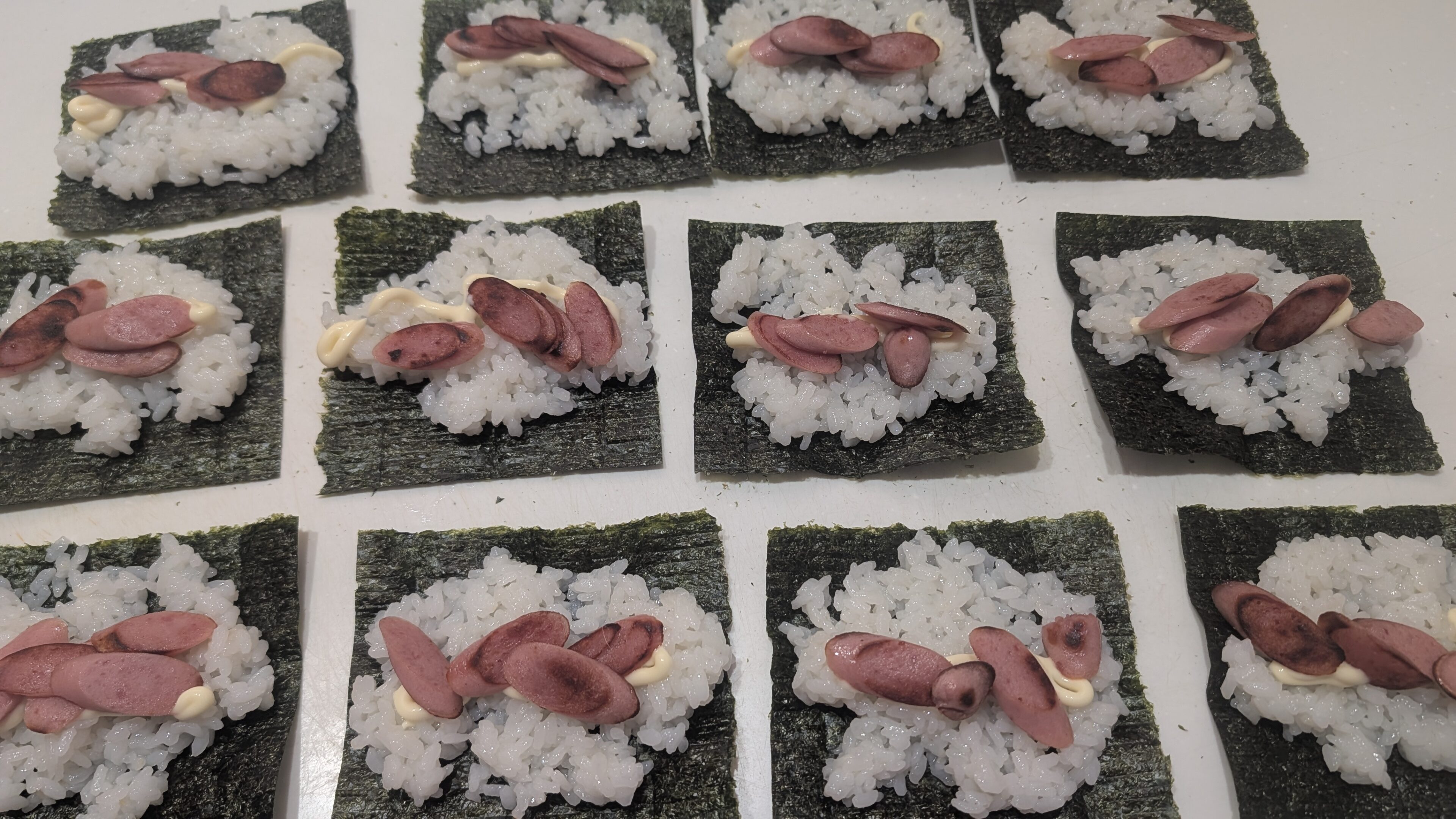 あとは、全形の海苔を4等分にして並べ、その上にすし飯をのせ、マヨネーズを少し。