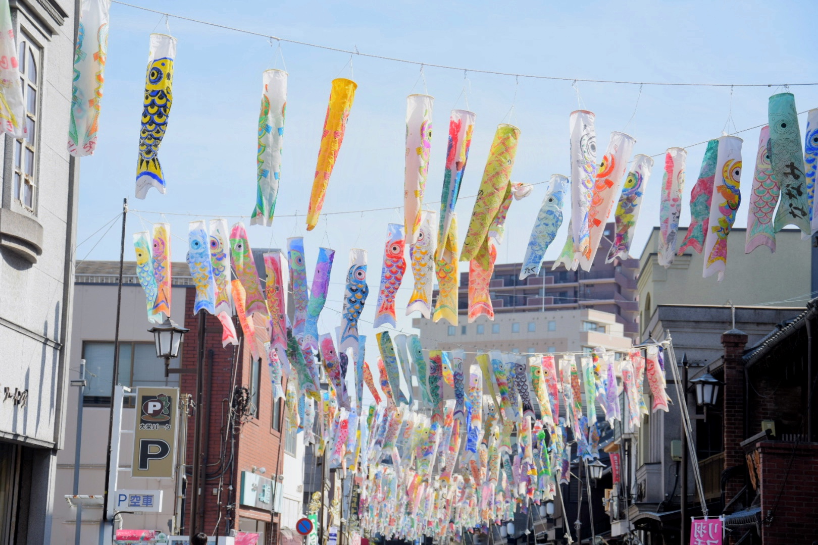 大正浪漫夢通りでは、色とりどりの鯉のぼりが空を泳ぐ「およげ鯉のぼくん」が開催中!子どもたちや地域の人々の想いが詰まった手作りの鯉のぼりは、見上げるだけで心がほっと温まります。