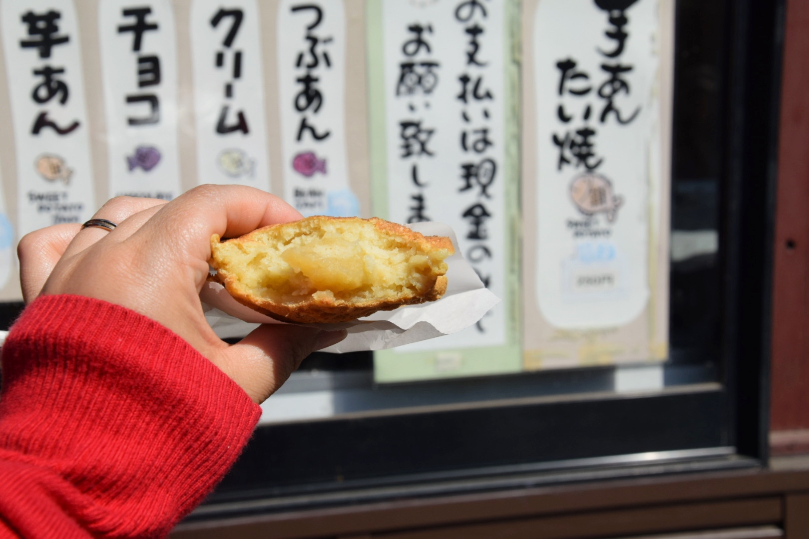 つぶあん、チョコ、クリームなどたくさんの種類がありますが、今回は川越ならではの芋あんをチョイスしました。