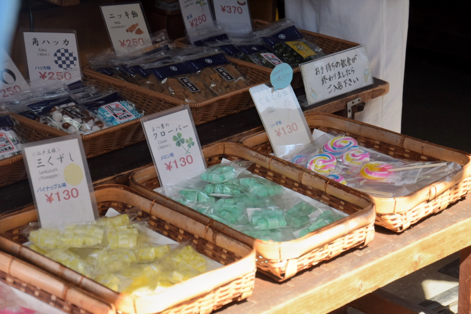 色とりどりの手作り飴が並ぶ「玉力製菓」。ひとつひとつ丁寧に説明してくださり、タイミングが合えば試食もさせてもらえますよ!