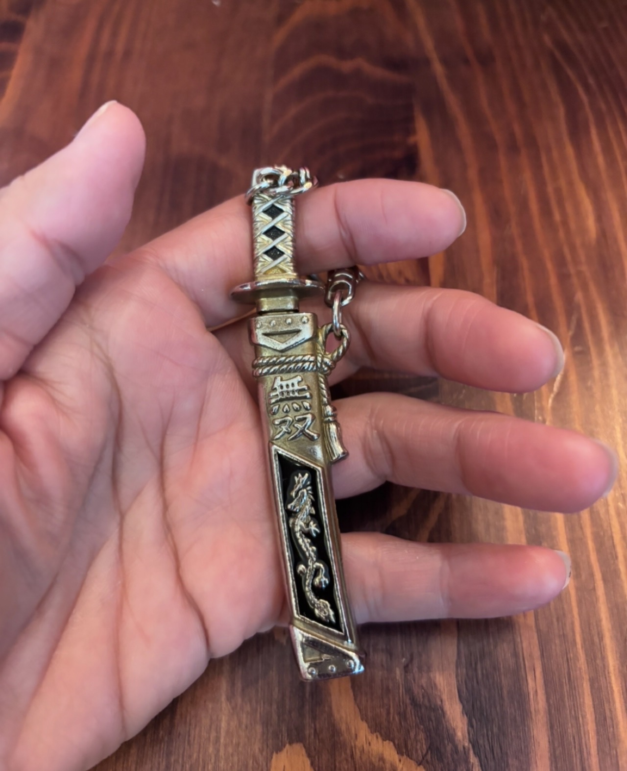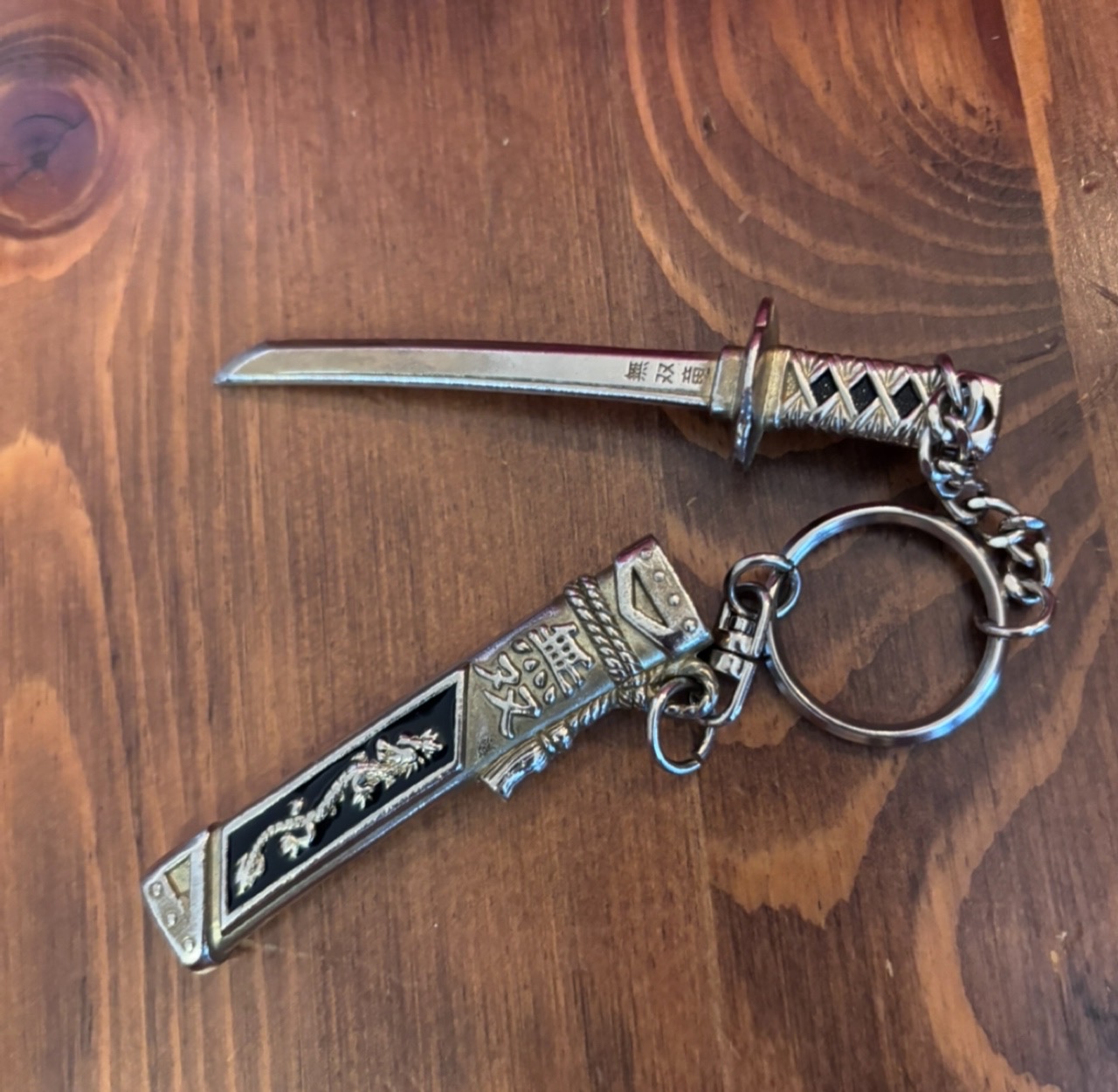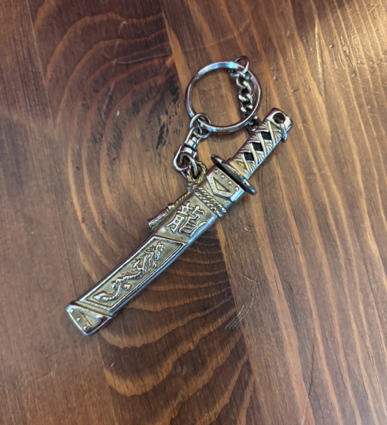 小さいキーホルダーで、手に収まる位のサイズなんですが、鉄製で剣の形をしたミニチュアキーホルダーでした。